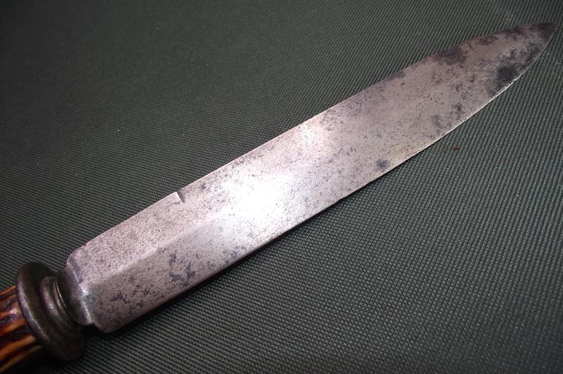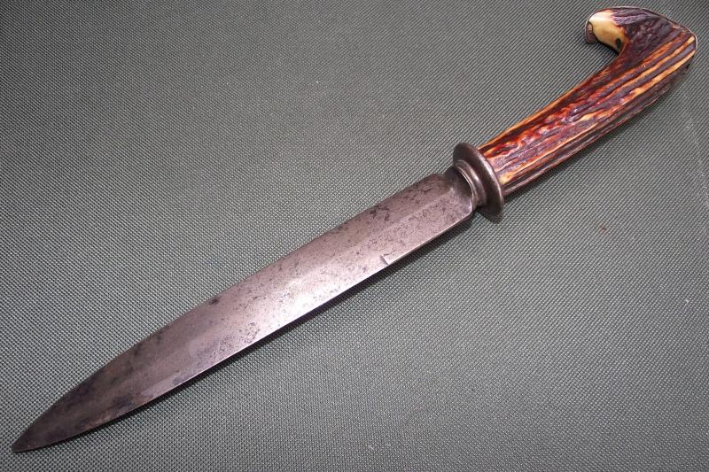 A very nice early spear point manufactured in India by one of the best firms producing hunting knives, spears and daggers, Arnachellum of Salem in Tamil Nadu. The marked blade is in nice condition considering its age with staining and some pitting from water damage, mainly to one side, point has worn from age. The round cross guard design matches the way the blade has been forged with a round end,its stained and taken on a dark patina. The pommel is shaped around the curve of the stag handle, metal is a bit misshaped from use but period as can be found on a number of Arnachellum examples. The stag handle has no chips or cracks. Total length from blade tip to pommel end is..12 inches.