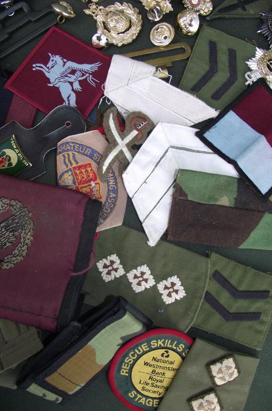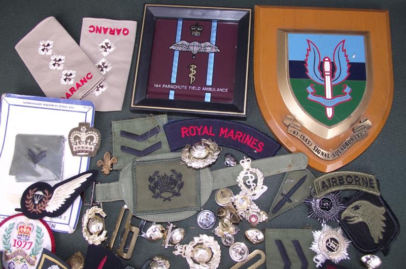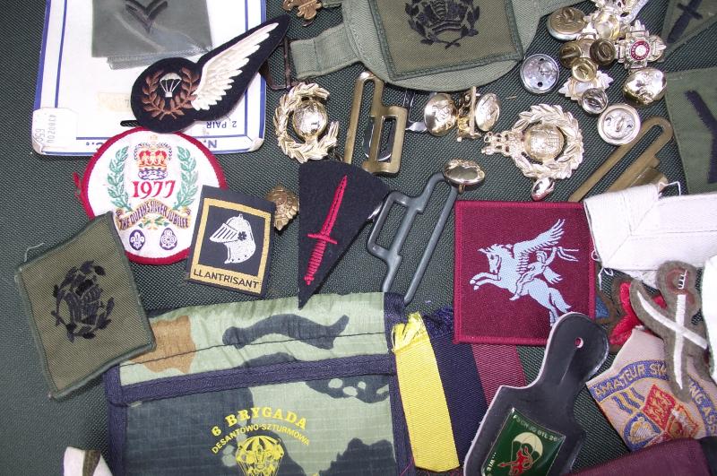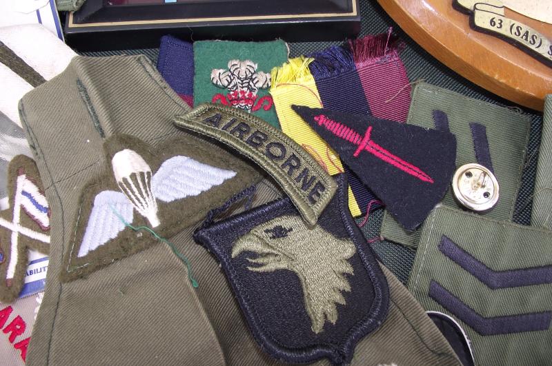 All items collected and used during the squaddies time serving and training over a number of years with many units from Europe and the States. I must add that his stay bright cap badges have had the prongs cut off for some reason.