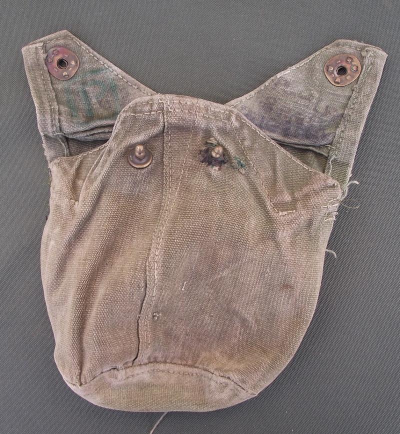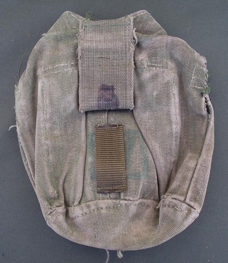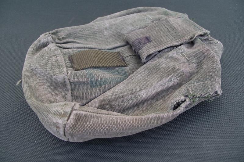 A well used 44 pat water bottle cover as modified and used by special forces. Lots of staining and a couple of field repairs.