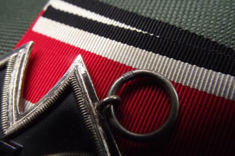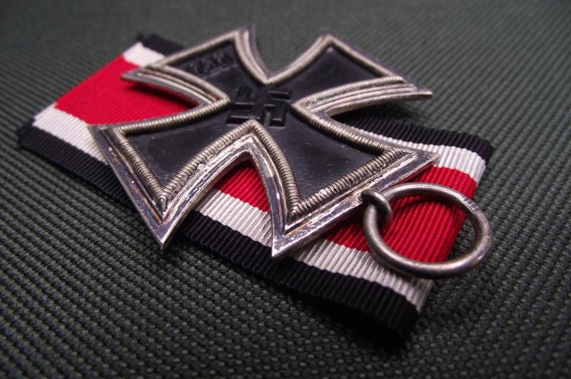 Very nice condition cross by the firm Aurach of Dresden. The iron center has close to 100% of its factory finish, the tight two piece frame has a good amount of frosting found underneath a dark patina. The ring has a clear makers code, 113. Comes with a very nice length of period ribbon.