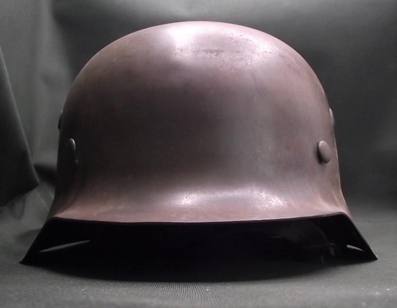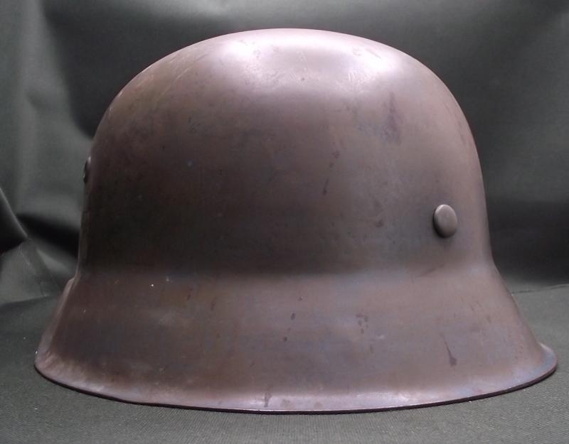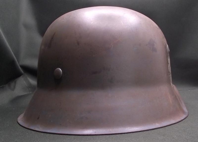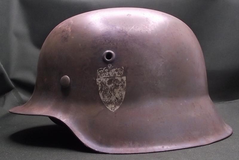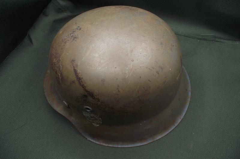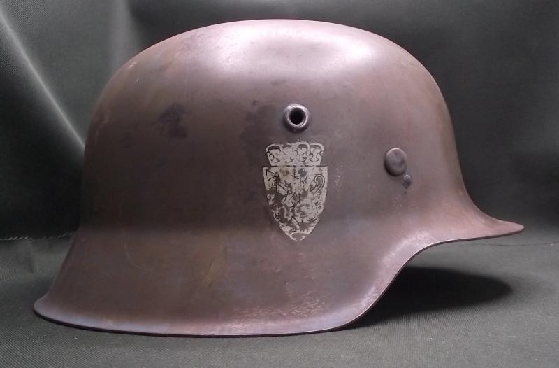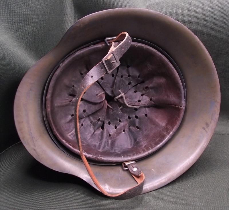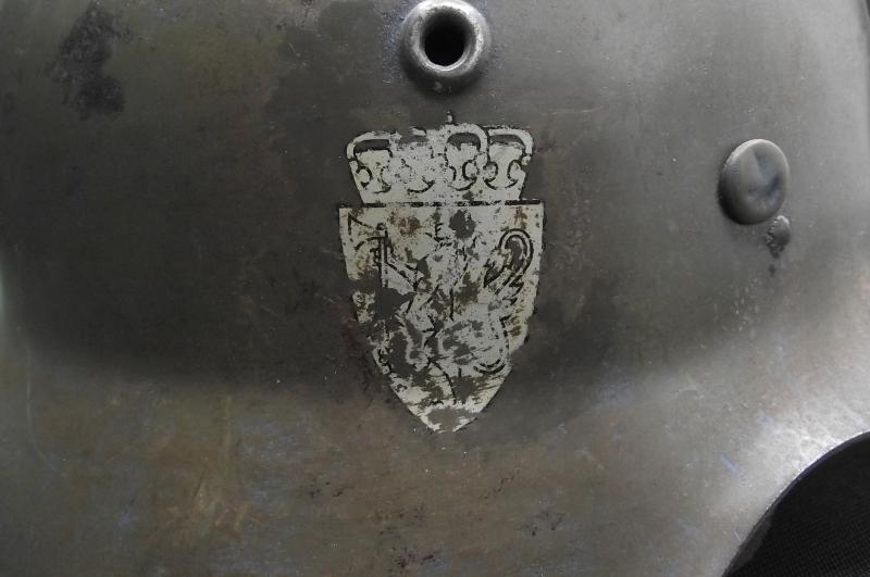 A very nice helmet that at one point has had a number of coats of paint including reissued to the Norwegian army. The large sized shell is solid with no pitting , stress fractures or ''dinks''. Inner liner is a WW2 example, dyed during its reissue, clean, solid and supple. The chinstrap is a reproduction. Perfect restoration piece or leave ''as is''.