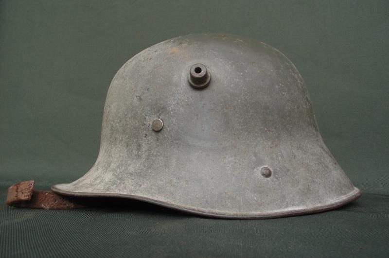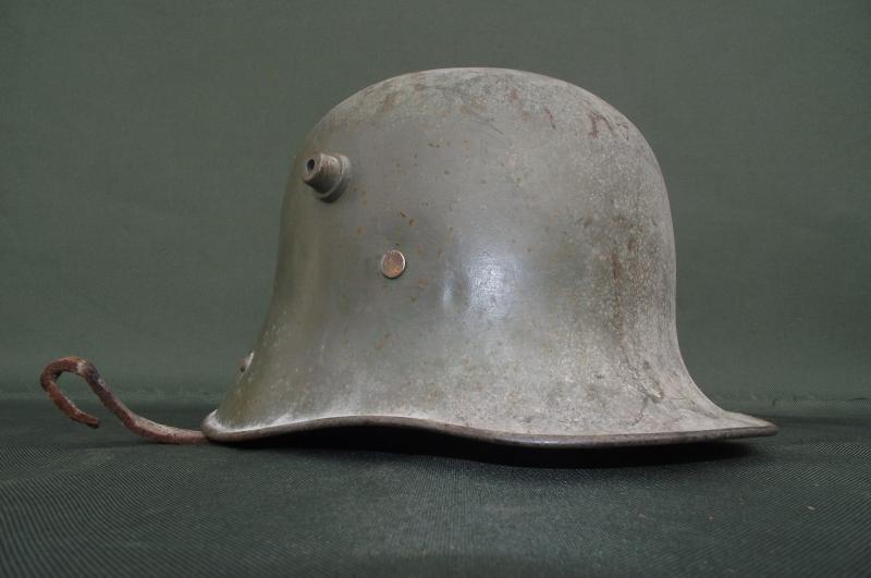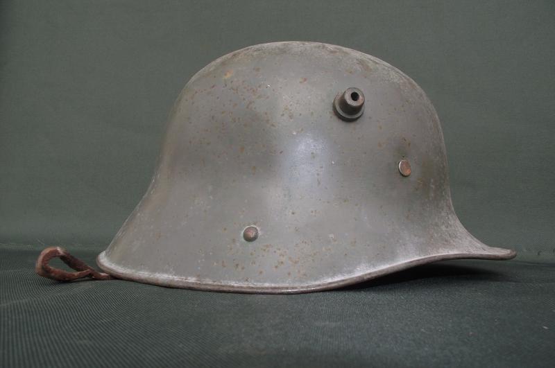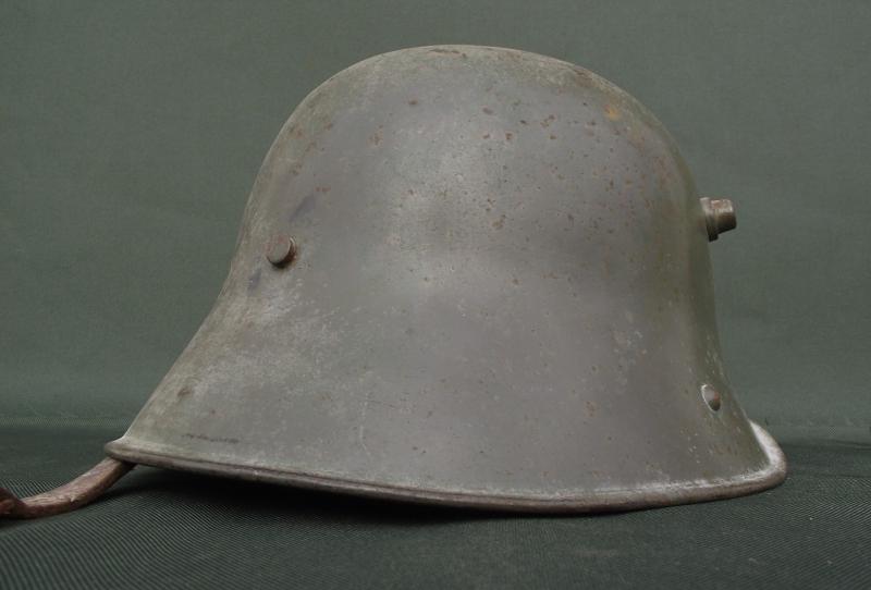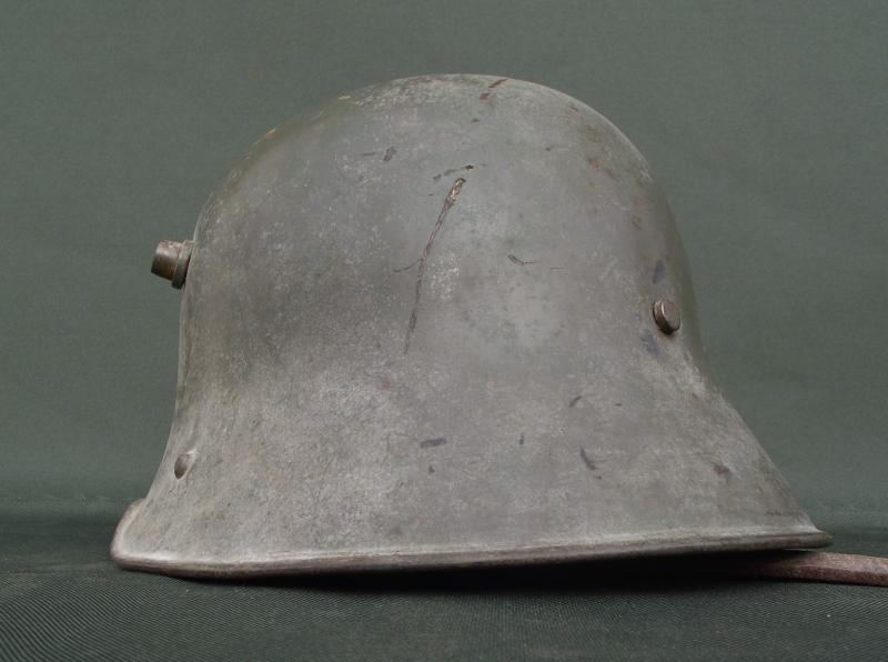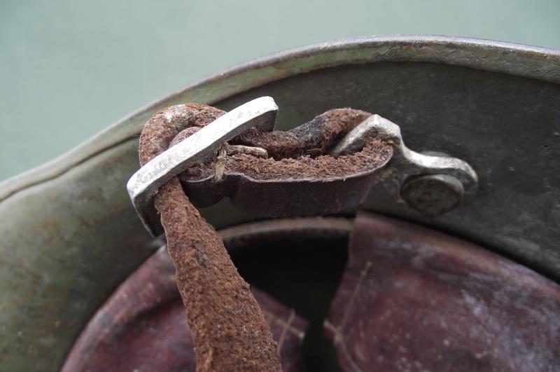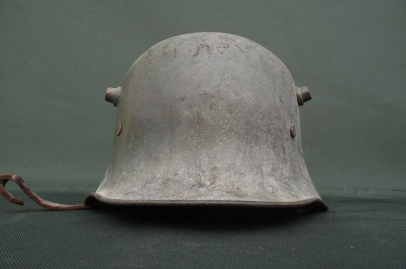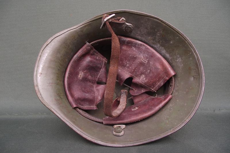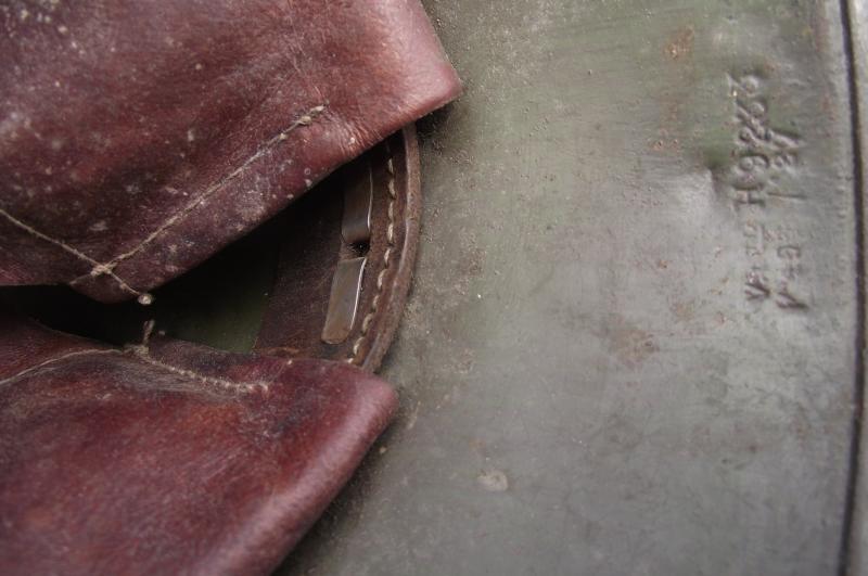 Solid helmet shell produced by the firm Vickers, clear makers stamp to the rear inside. Green finish is close to 90% complete with some white powder coating from storage, will clean away with a damp cloth! The inside liner system is a WW1 type reproduction being fitted with reproduction liner pins. The chinstrap is the ''Irish'' type fitted to M27 lids. Restoration project or perfect use for reenactment!