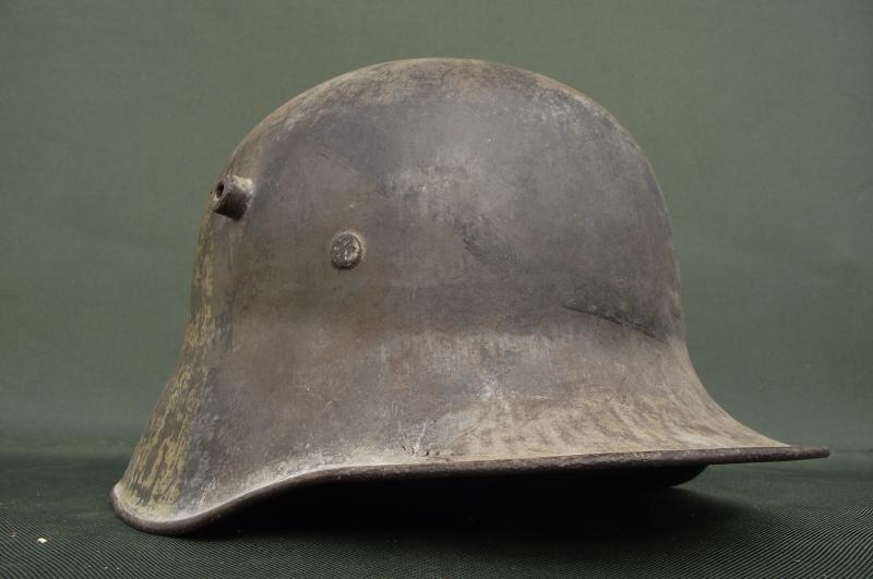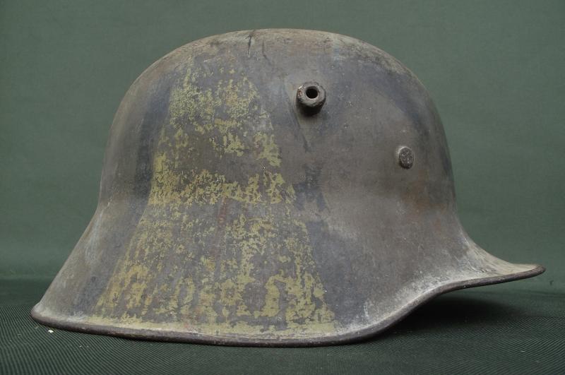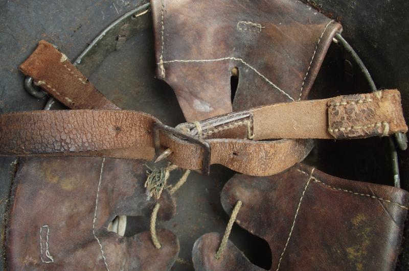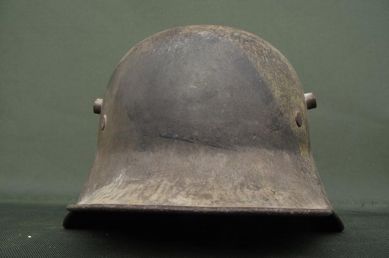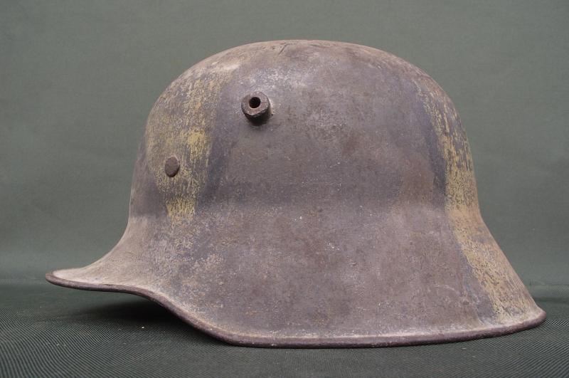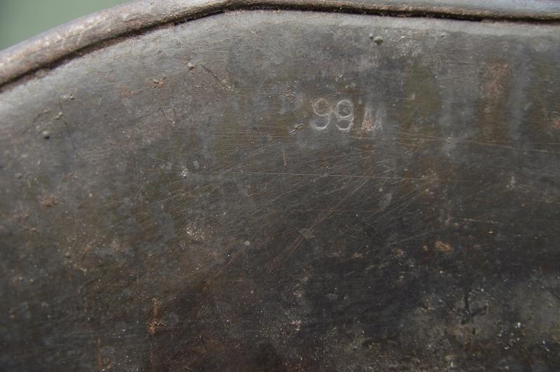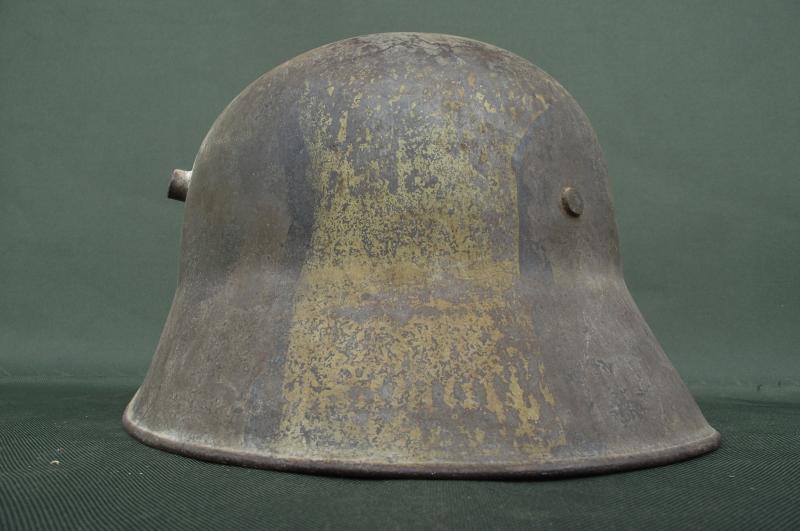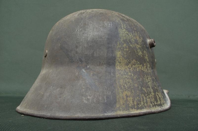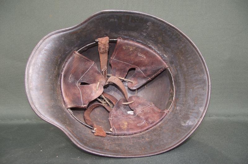 The period shell has had a number of finishes over the years, at some point someone has removed the top coat to reveal a period WW1 camo finish. The large shell, size 66, is solid without pitting or fractures . The inside liner system is a reproduction, all inner pads present, and the addition of a really old chinstrap, please check photos for more detail. The helmet shell is stamped W66, good size for display and of course for fitting on your ''noggin'' if your a reenactor!