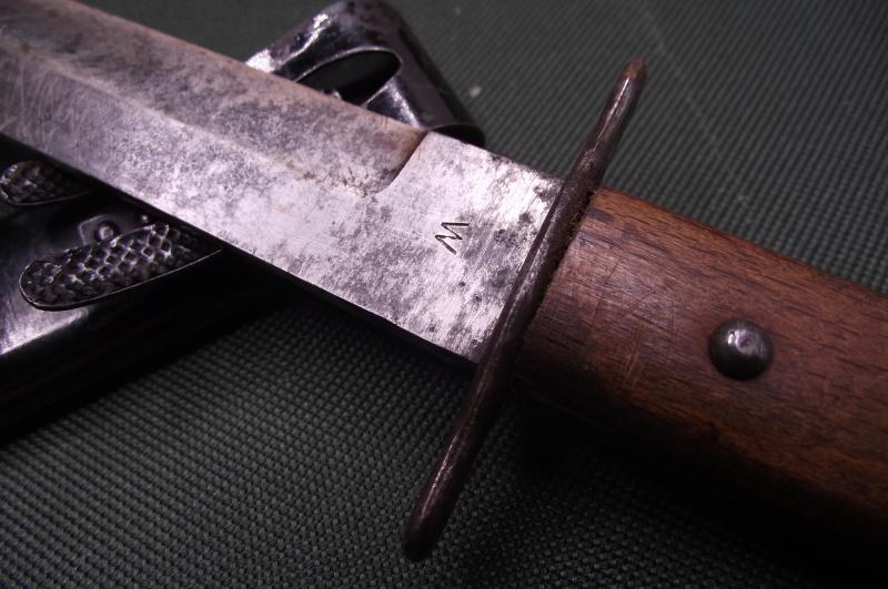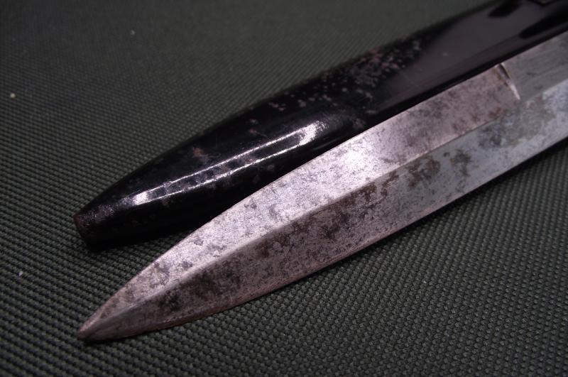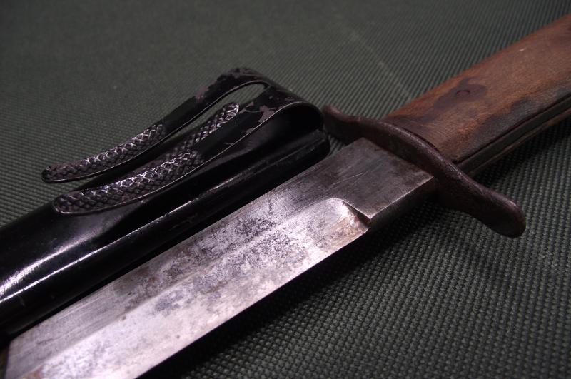 A very nice used example with the blade having staining and slight minimal surface pitting , hard to make out, one side has a clear ''W'' stamp. The cross guard is straight and suffers some surface rust, Wooden handle has no chips or cracks just some staining with all three rivets intact. The metal scabbard has close to 100% of its factory finish, no dents etc and all three fixing prongs are present.
