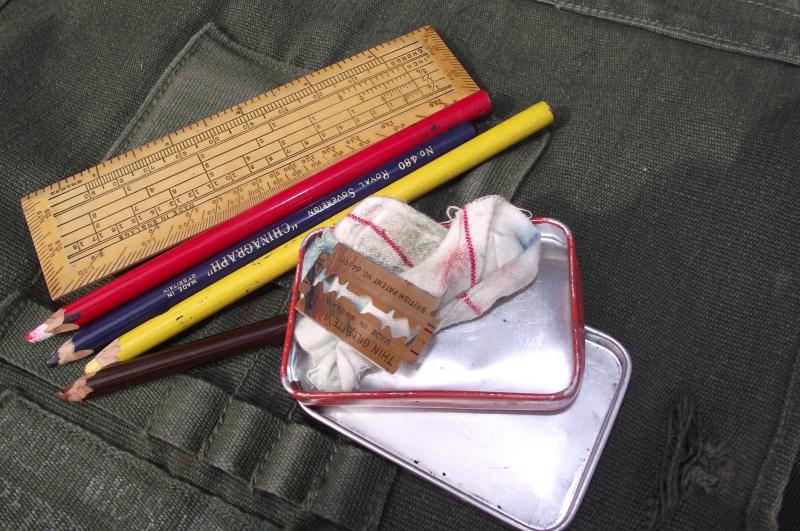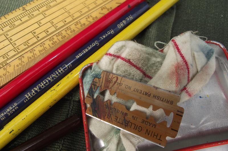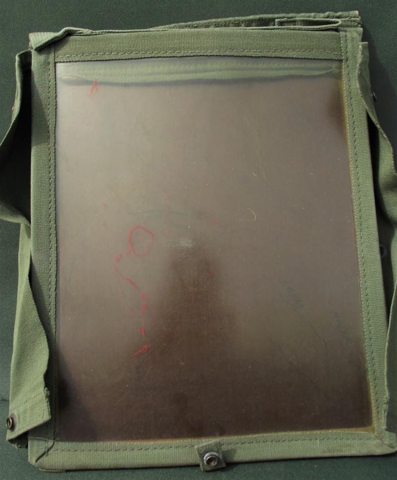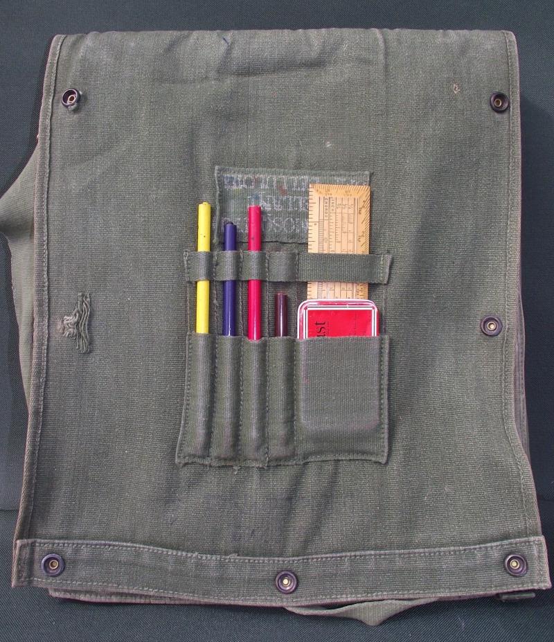 Nice used map case with a faint 1945 date to the inside. This example has its period chinagraph pencils found inside with ruler and a tin holding a razor for sharpening the pencils. Some pencil marks found to the inside map sleeve.