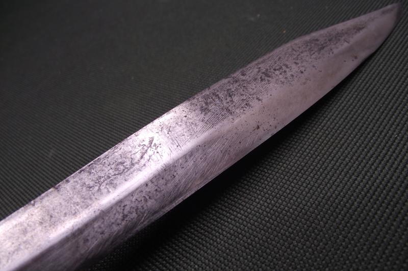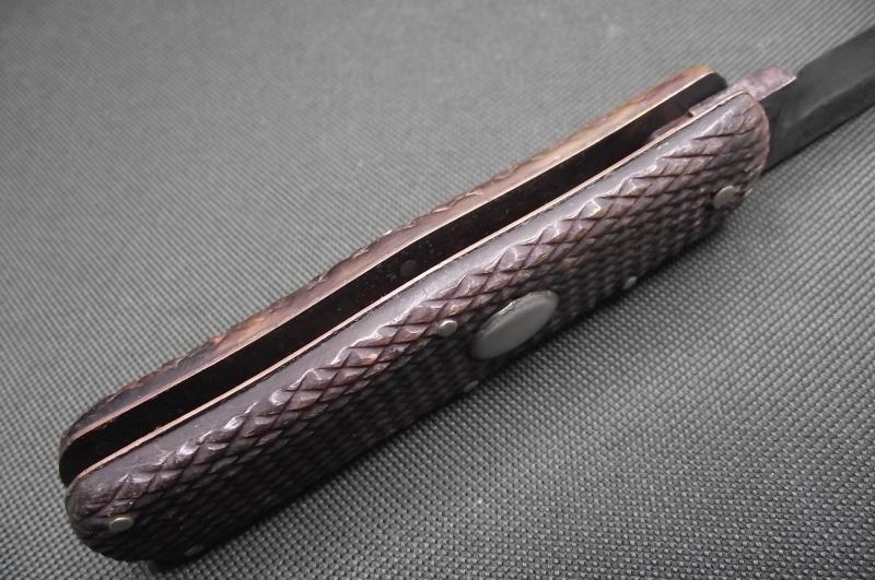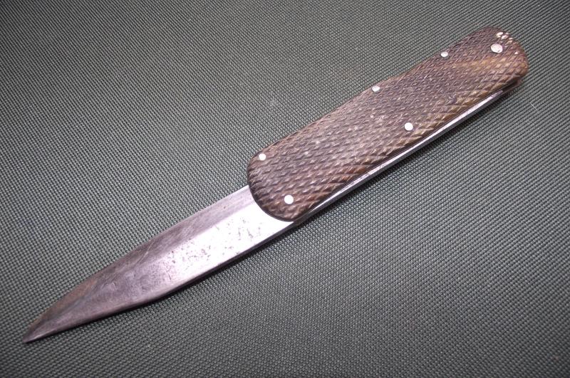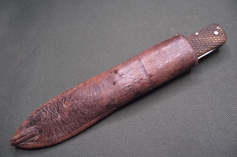 In nice condition with the 7 inch blade having some staining and marks with as expected a cleaned surface, clear makers details to the bottom. The patterned handle has no chips cracks or dents. Central button works perfectly. Spring is string and tight. Comes with a leather scabbard that might date from the period but has been added at some point.