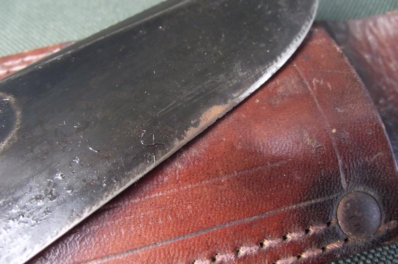 A very nice example with the clearly marked 8 inch blade having close to 100% of its very dark factory finish. Some spotting from storage and ive just notice one minor rust bleed to the cutting edge. I have not tried to take the bleed out as im a bit of a ''Bull in a china shop'' when it comes to cleaning blades so will leave as is for the new owner.The cross guard and pommel have a good amount of period finish and plenty of dark patina, i must stress the cross guard has a tint wobble. The leather washer grip is very nice with no loose or dry areas, again the top and bottom plastic black and red rings are complete and tight. The period leather scabbard is very clean and supple with a tight and undamaged to fixing strap. All in all a very nice example.