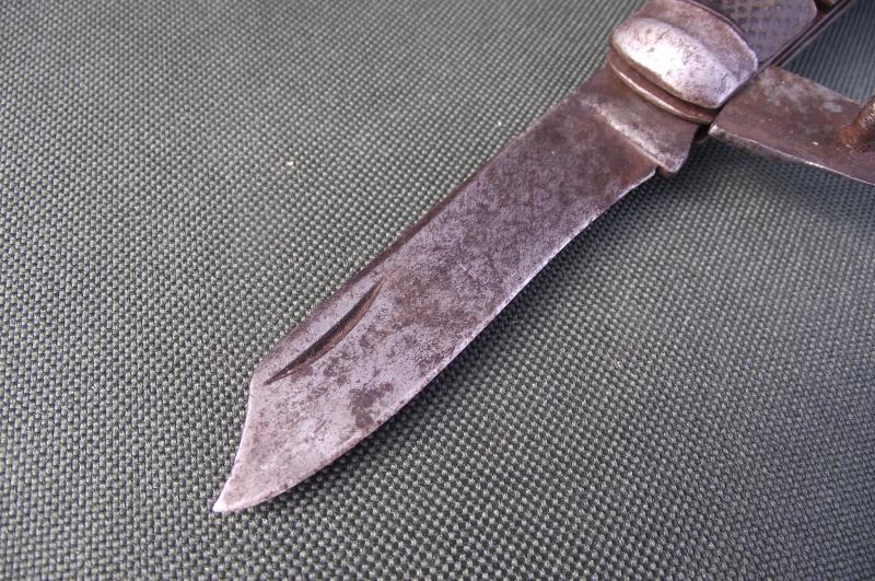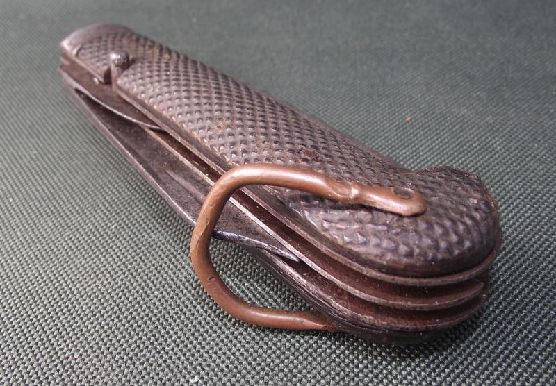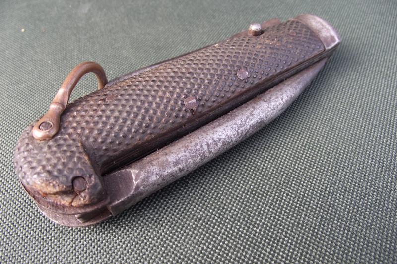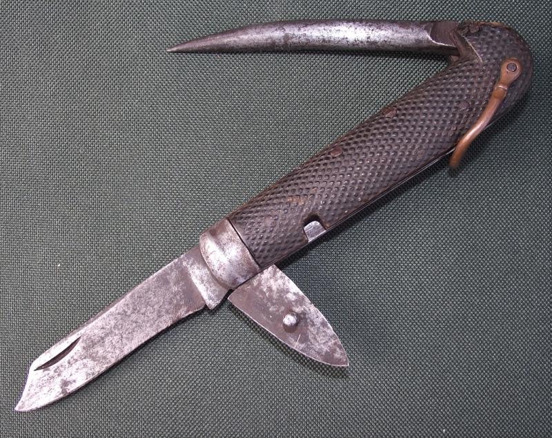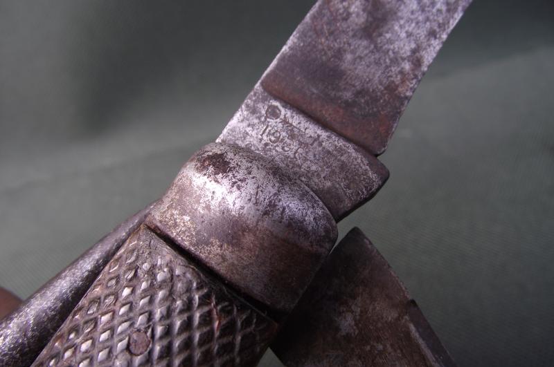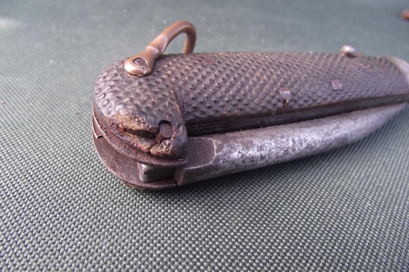 A well used example with the main blade having at one point been fashioned with a bowie type clip point. The overall metal components have taken on a dark tone from age and storage. The blade to me looks to be dated 1938 but might be earlier. Inspection stamp 6 with a broad arrow stamped to the spike. Both grips are complete without cracks just one area of dame near the back. Copper shackle is tightly attached to the body. I must add that the clip point addition is not new to the blade as the edge has plenty of patina and various marks from age that does correspond to the rest of the blade.