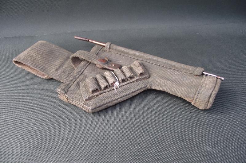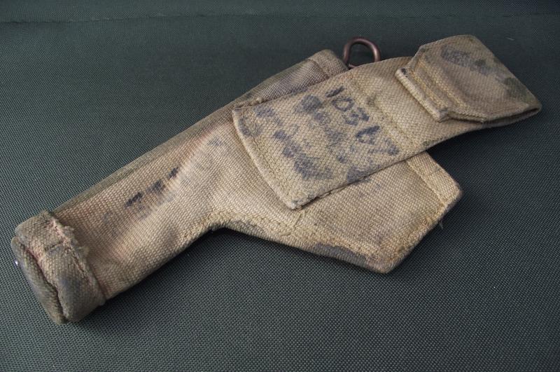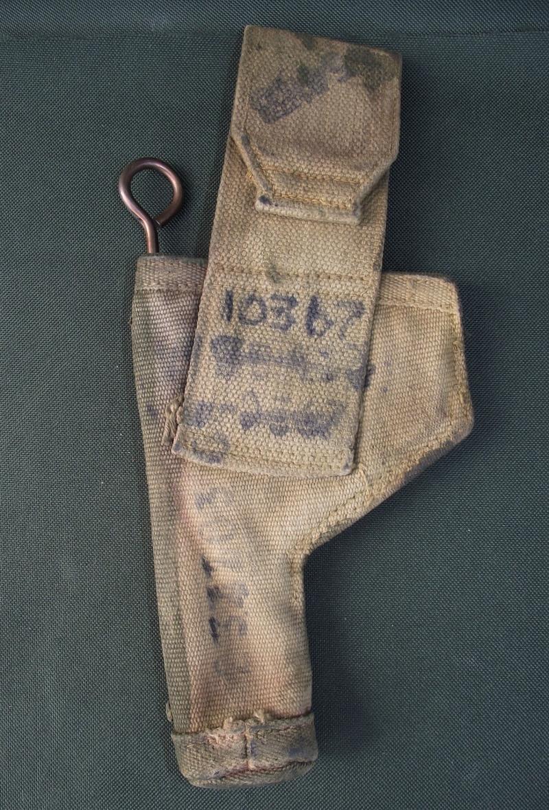 A used, factory modified first pattern, tankers open top holster with a dark green blanko to the front. The rear has its period web finish with plenty of black stamps and some staining. Inside the modified loop can be seen the date 1942. The cleaning rod was found in the side sleeve when i purchased the holster so it will be sold ''as is''.