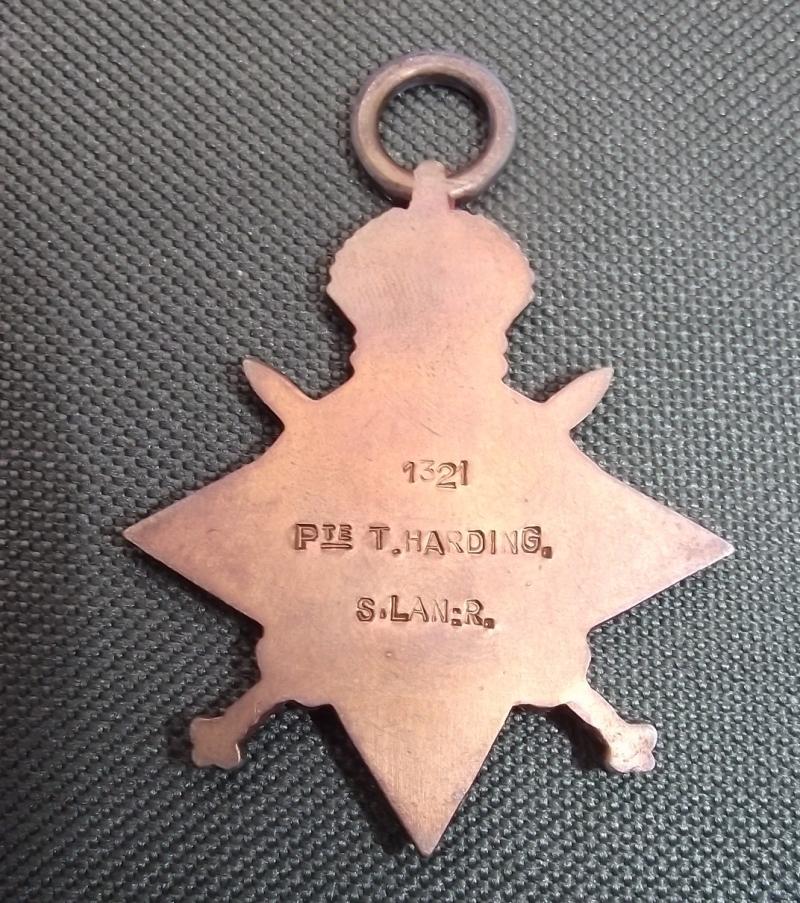 Single 1914/15 Star to ...1321-PTE-T.HARDING-S.LAN.R. According to his medal role Thomas entered France 5/12/14 and died of wounds 24/1/15, poor lad last just over a month overseas!