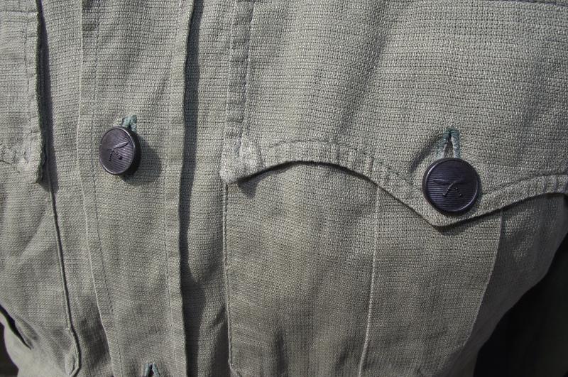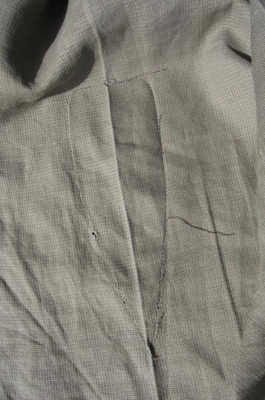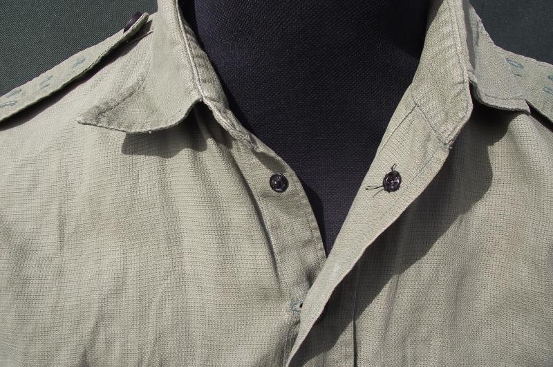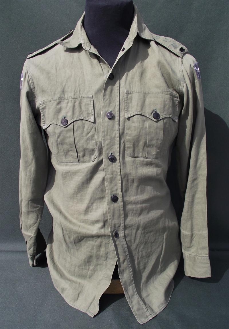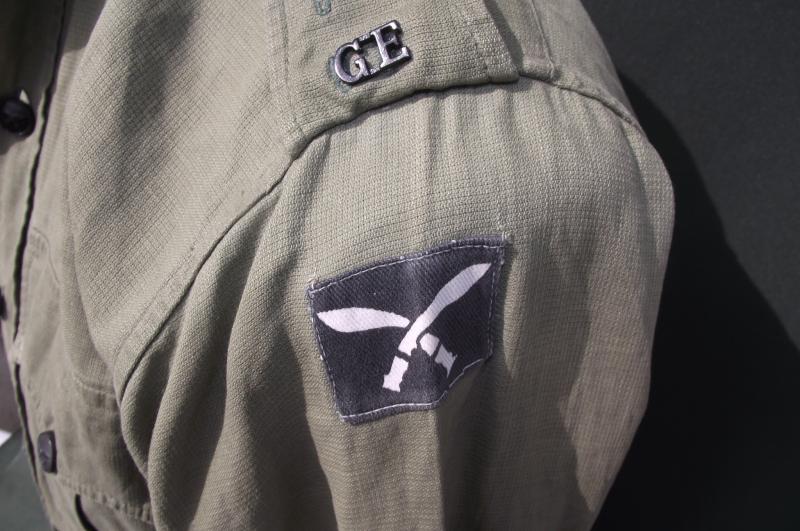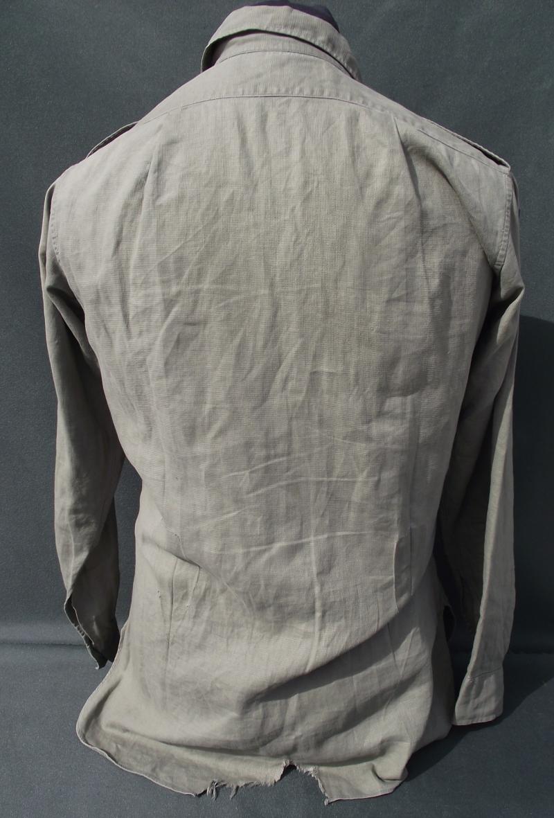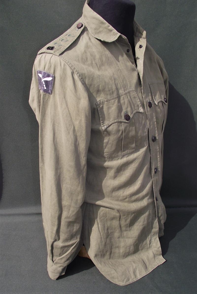 A very nice and well used JG shirt to the Gurkha Engineers with printed 10th divisional patches machine stitched to the arms. Both shoulder boards has ''GE'' metal titles and all buttons are the horn/wood Gurkha type. There is one area of damage to the rear and this can be expected by a used item. Faint marks to the neck area, perhaps owners details and as for size i would say medium to large as worn by an officer in the regiment, both side sizing ''darts'' have been removed. Perfect for late war, take off the titles and Malayan Emergency display.