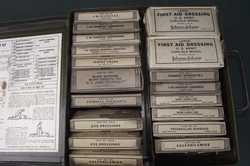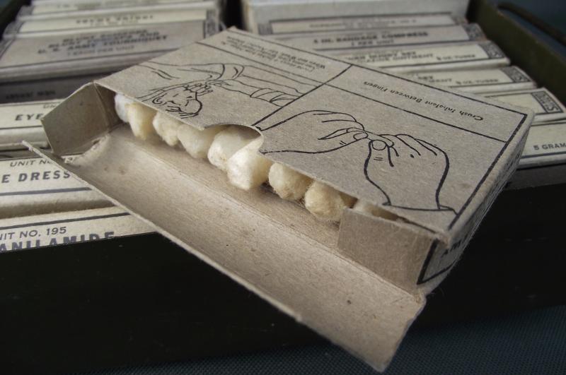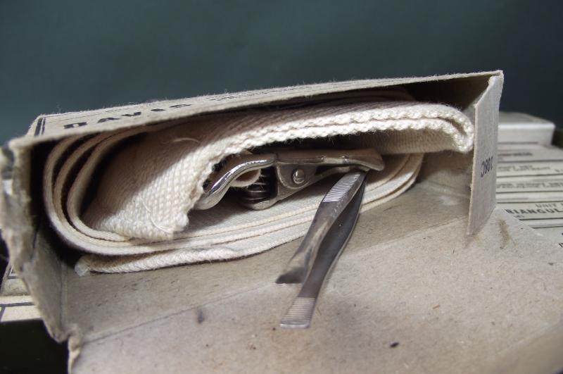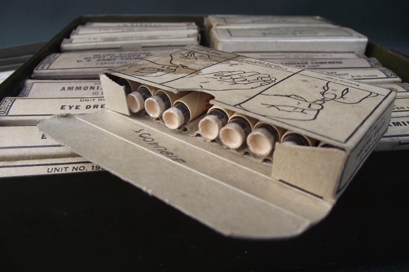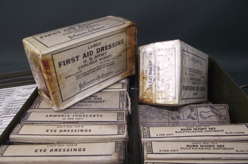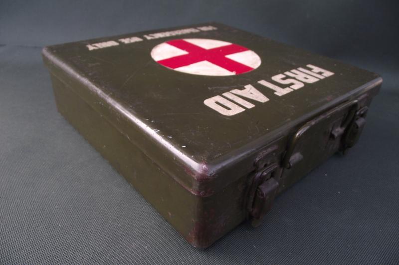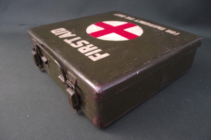 The outer box is very clean without dents, complete finish with clear details. The inside has nearly all its contents, couple of items missing including the blunt scissors in the tourniquet box. Couple of storage staining to a couple of the cardboard boxes. Just as a matter of interest this was given to a friend of mine over 35 years ago by a British Veteran who served in Sherman tanks,the only item he brought back from Europe!