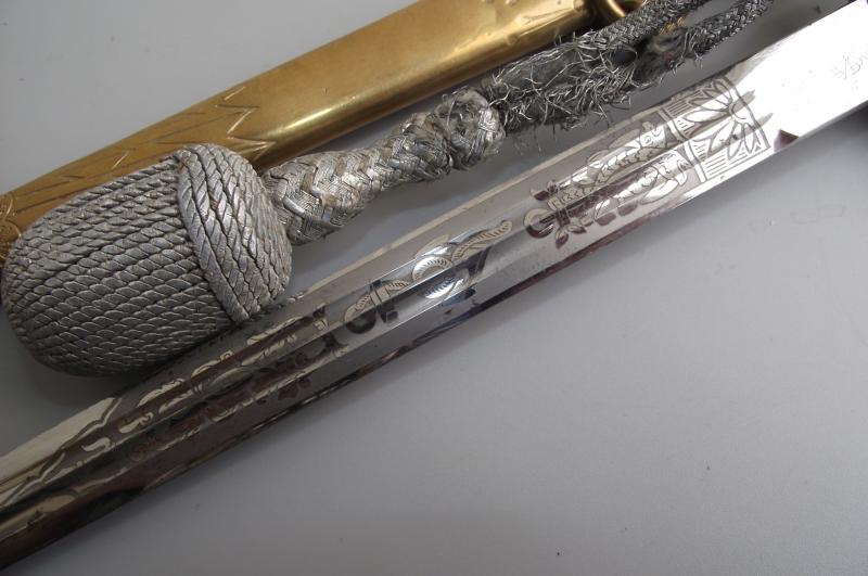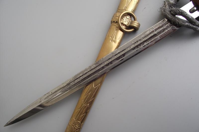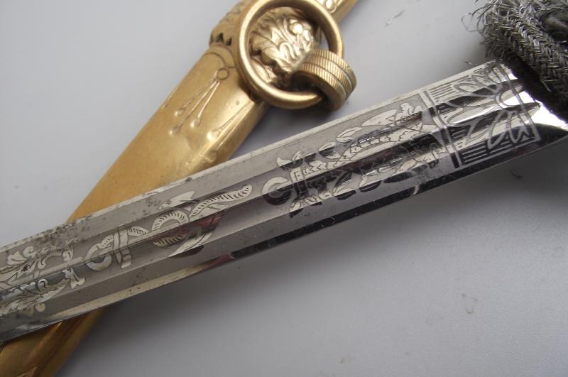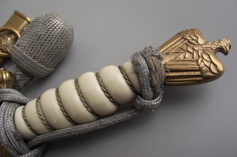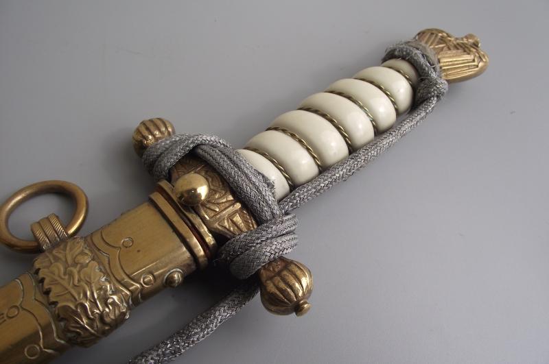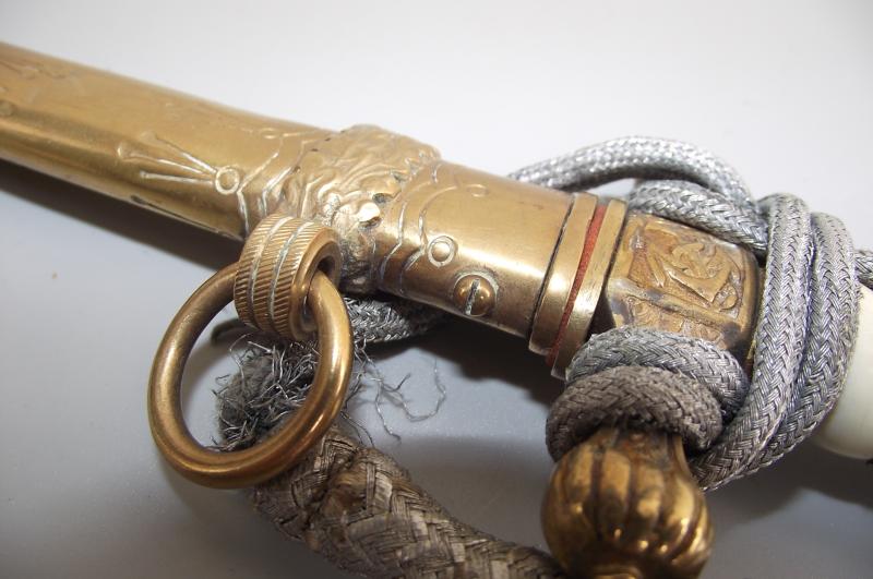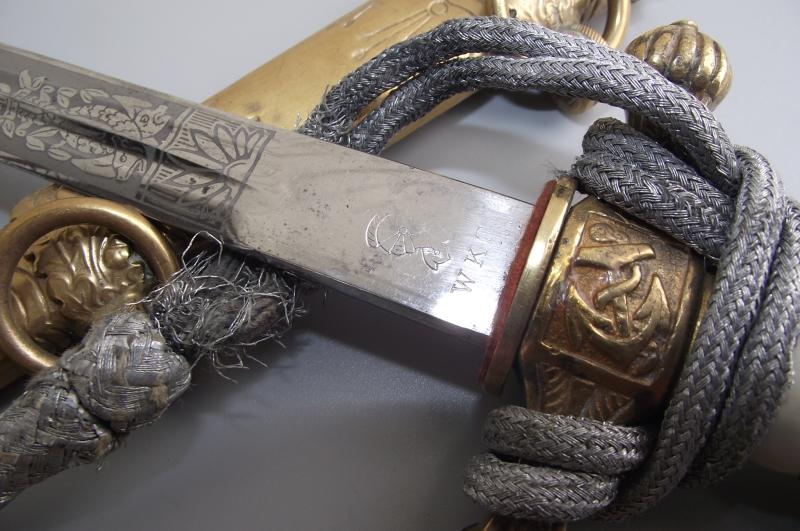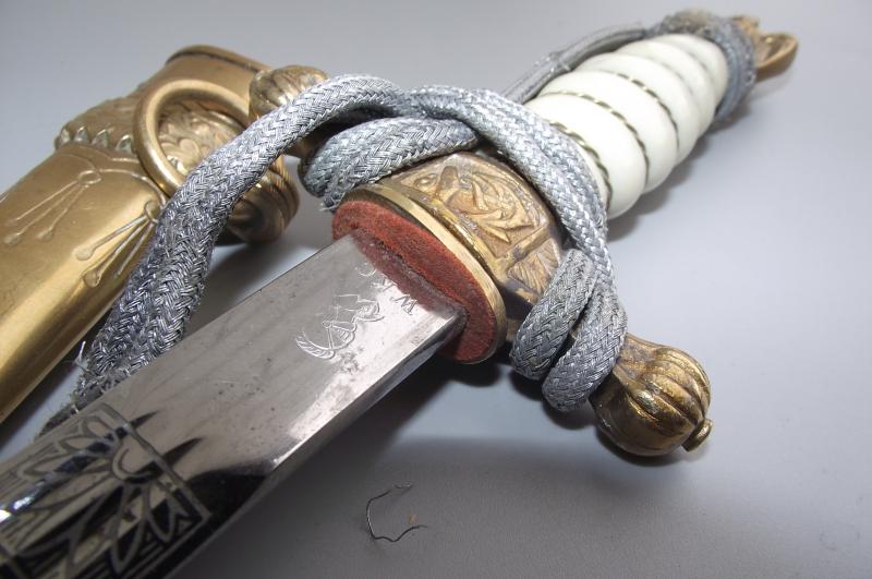 Untouched dagger by the firm WKC with bullion knot. The Anchor etched blade is very clean without pitting and staining, etch panels are sharp with nice grey finish background, tip ends in its fine factory tip, clear makers stamp to one side. The cross guard and pommel having nearly all finish with certain wear to the pommel from the bullion knot. The pommel is slightly loose, might take an extra turn but will leave this to the new owner, might well have been like this for many years. The clean undamaged white handle has its complete single wire. Bullion Portepee is complete with some wear around the high points and above the bottom bulb from use. The scabbard is complete with nice finish and free from any major dents. There are a couple of small knocks from use and one small/ dent mark to the body between the Oak leaf brackets, so in my opinion a clean example. Both top screws are the period factory examples.
