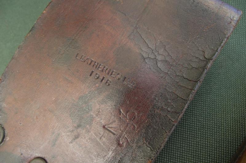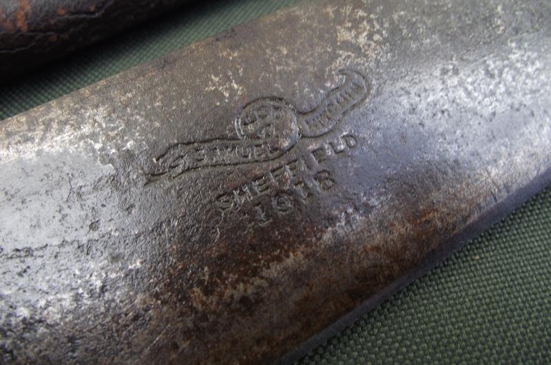 A nice used example with the 1918 dated blade made by the firm Samuel Kitchen, is in good condition with a certain amount of surface marks from storage and water and minor pitting, good sized broad arrow stamp to one side near the handle. For the age of this item the cutting edge has not been over used or sharpened. The handle has no chips or cracks just some surface dimples from age, all rivets present. The 1918 dated leather scabbard with makers details is supple with the only loose stitching to the bottom end. At some time the top retaining strap has been removed. This example is made by the same firm Kitchen as the WW2 example ive just listed, item 60983.