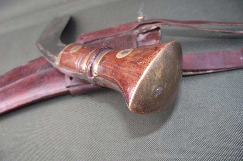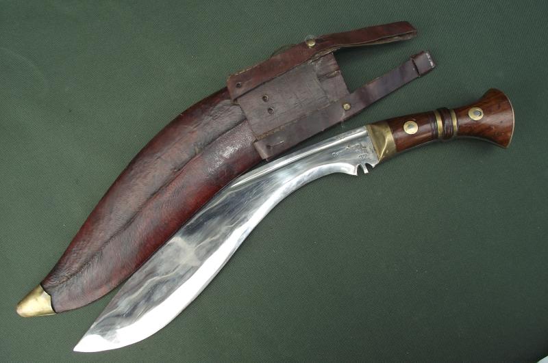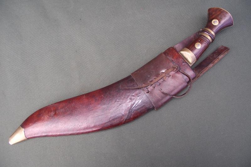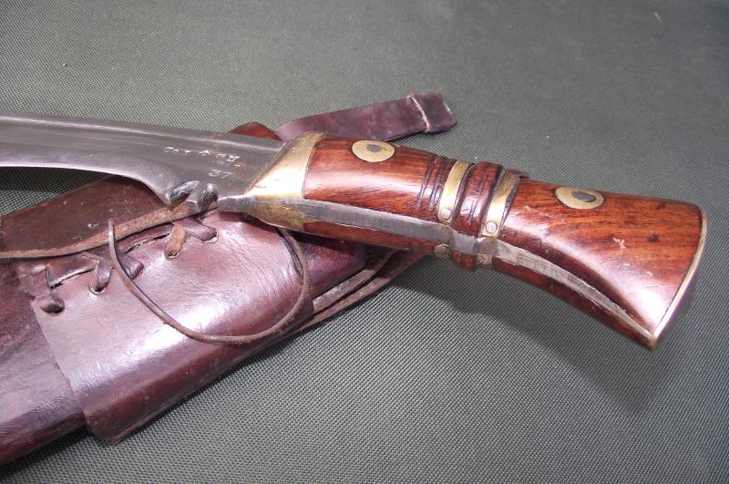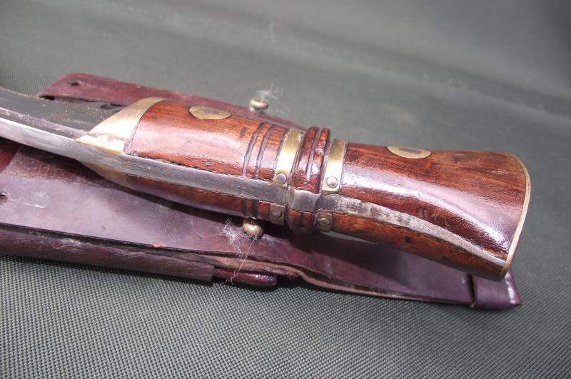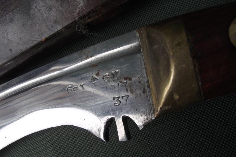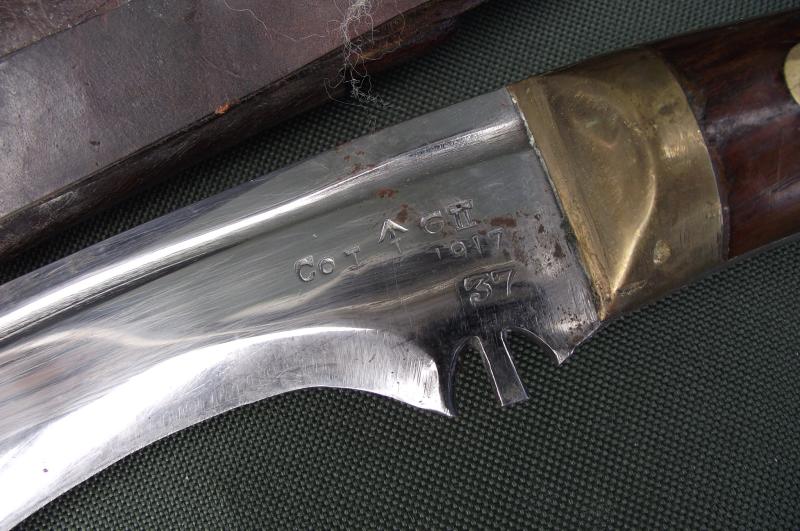 This reproduction is very clean , blade has minimal staining, marks, from storage, sharp cutting edge and clear military stamps to one side including the 1917 date. The two slab wooden grips have no chips or cracks just a couple of tiny bruises. End cap is tightly fixed to the blade tang. The leather scabbard is in supple condition with tight stitching and comes with its leather hanger.