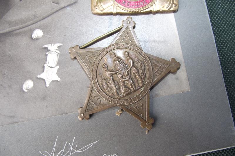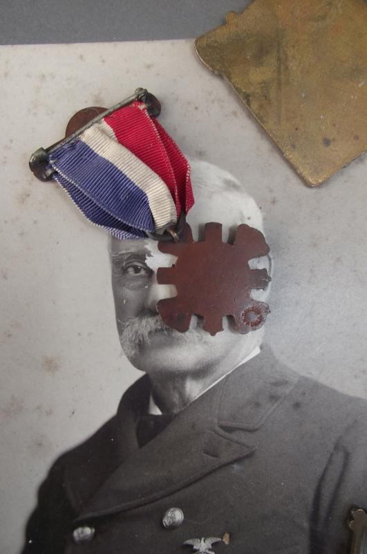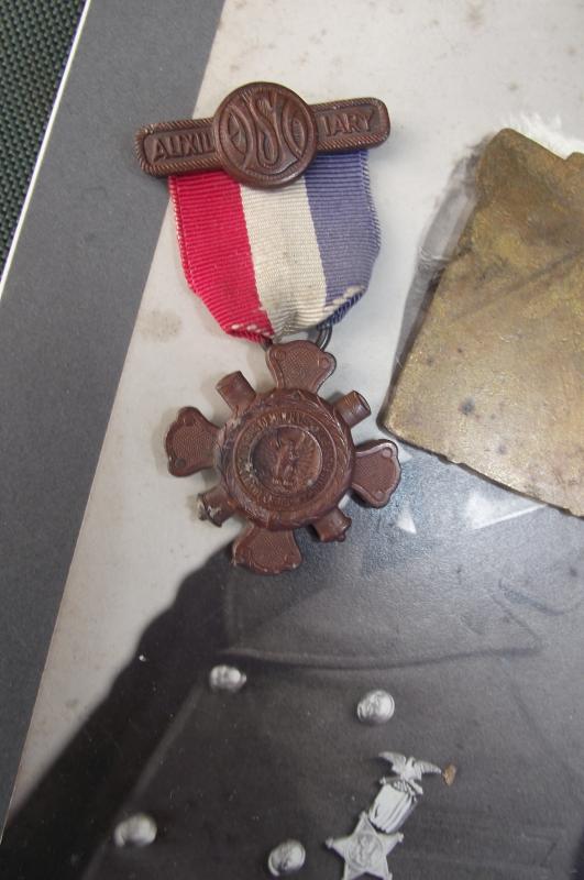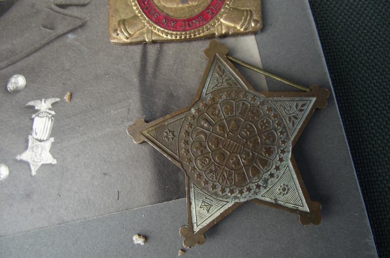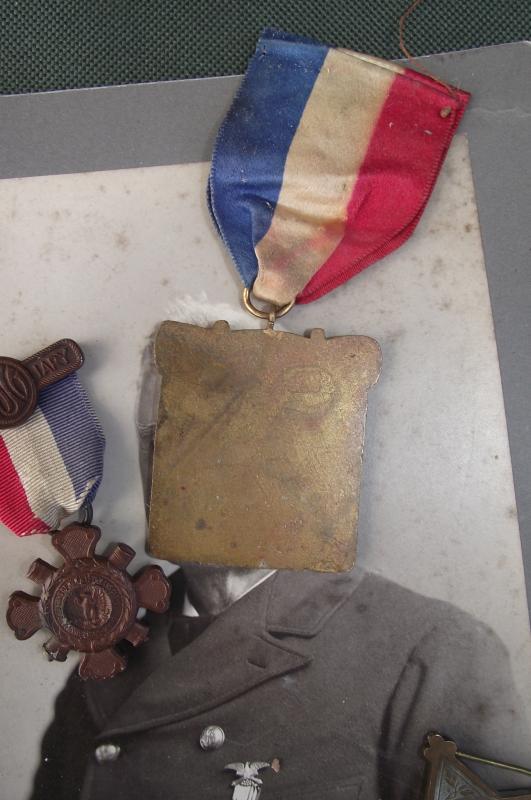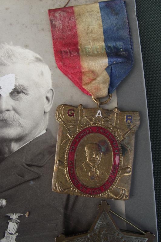 The portrait, with damage to the emulsion, showing a Civil war vet wearing a GAR medal comes with an early period, side numbered, veterans G.A.R. decoration without ribbon. Also found is a 1905 GAR encampment delegate medal and Auxiliary to the sons of union veterans medal. I purchased this lot together many years ago , are they all to the same veteran? Im not sure and have never tried to find the details to the number on the side of the GAR medal. Number is R11711.