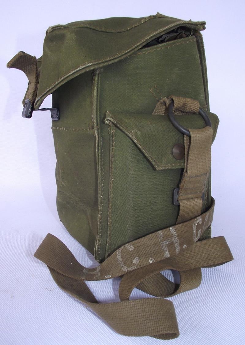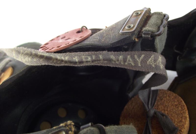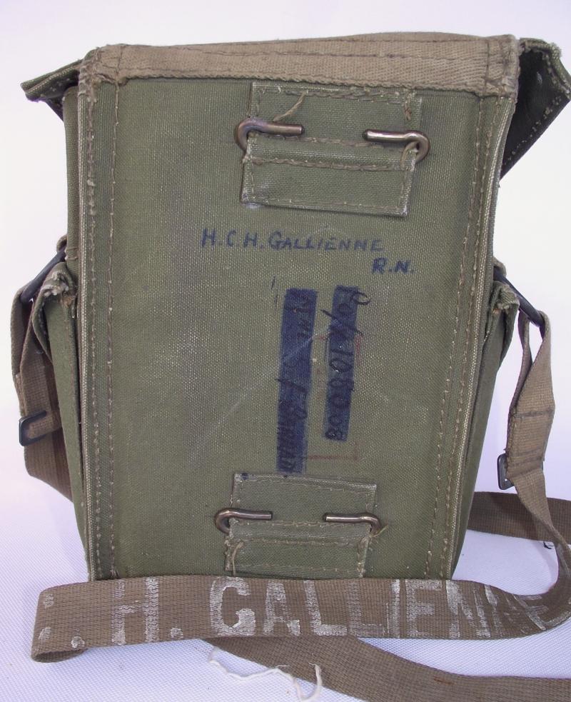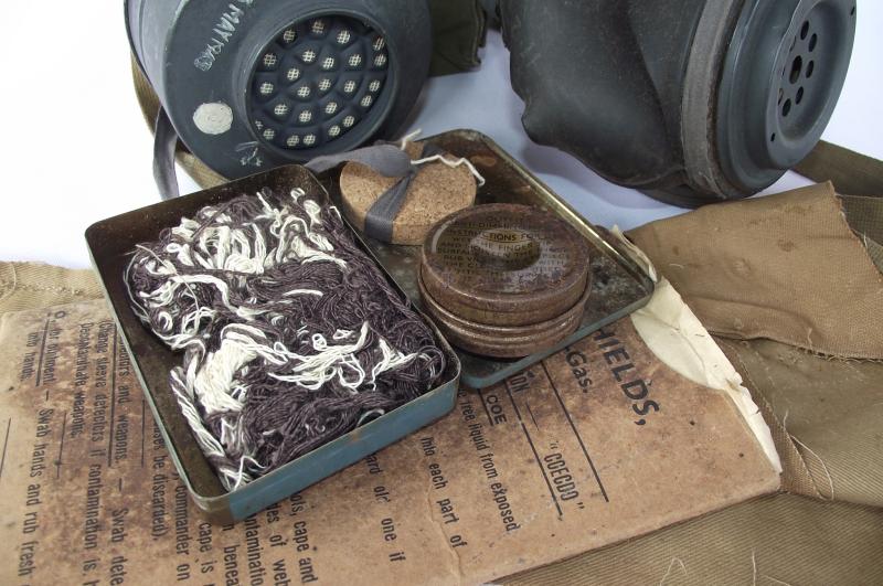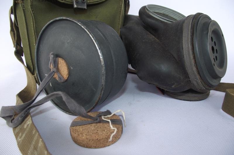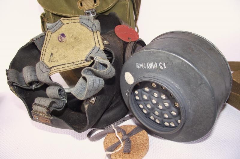 A very nice lightweight MK2 gas mask with not only a named bag, carry strap and owners dog tag, but the mask , filter and bag are dated 1943. Found inside was the anti dimming tin wrapped in brown material, anti gas shields and to the side pocket the anti gas ointment tin, now empty and containing the cleaning wadding. As an added bonus is the 1944 dated filter and mask corks, so this set would make a perfect contender for adding to any D-Day display, especially a naval landing collection and if wishing the set my be worthy of research.
