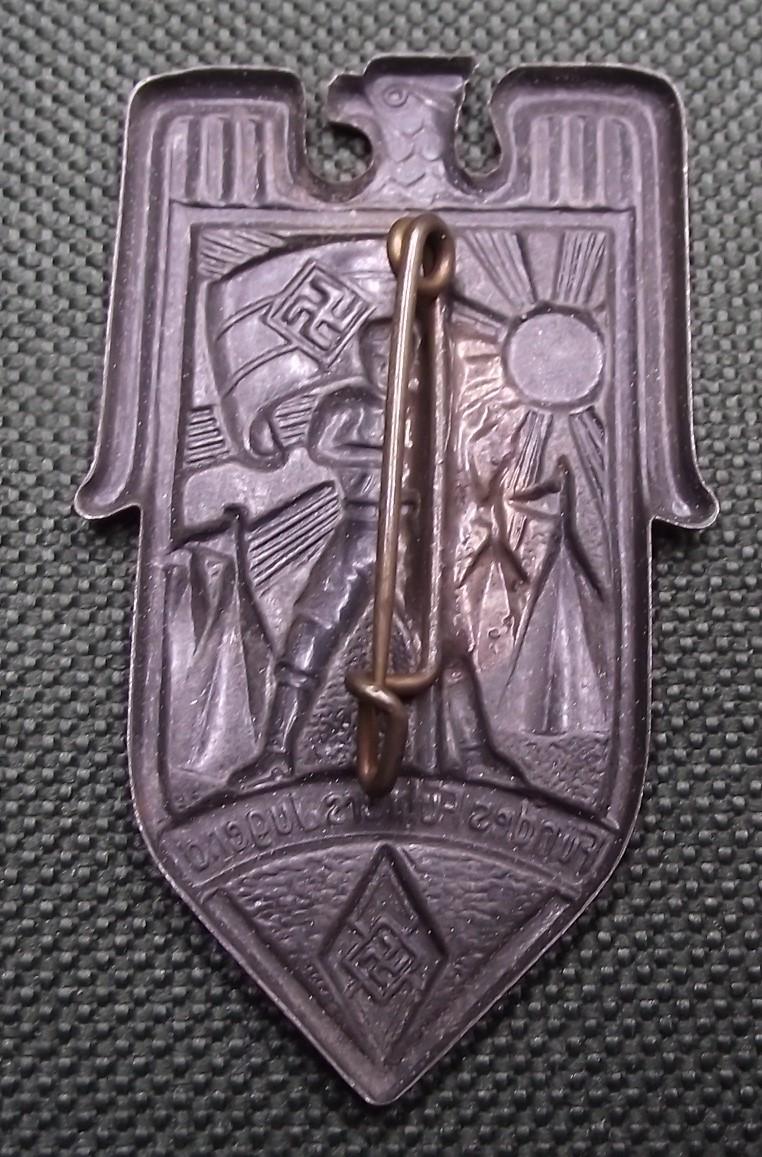 In very nice condition with close to 100% of its period finish, rear has its period fixing pin. One of two different finishes found on these event badges.