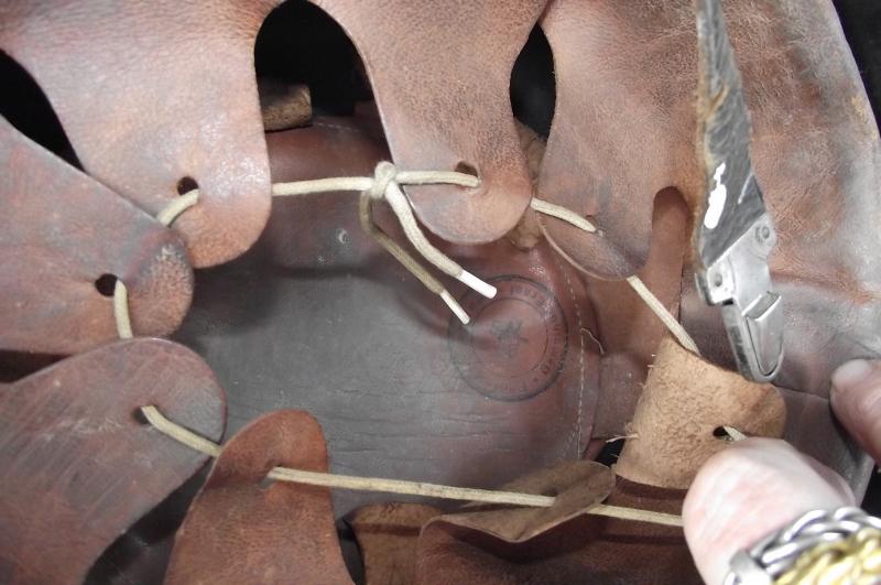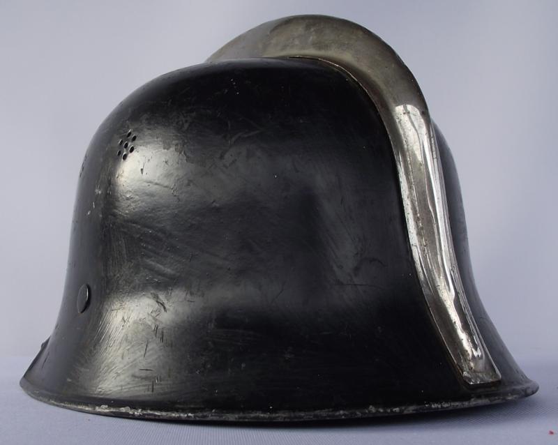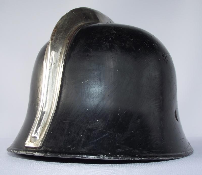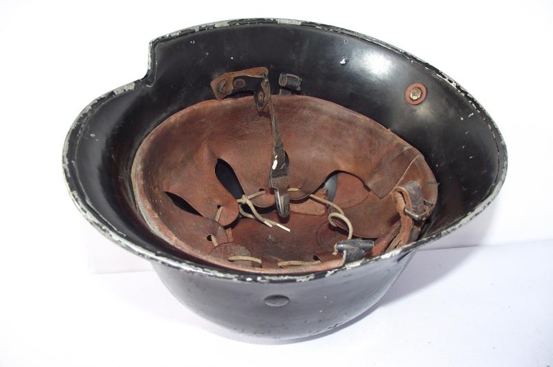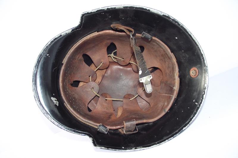 This example has had at least two coats of black finish, the last was applied by a brush, there might well have been decals at one point. Paint finish is nearly 100% complete, shell is dent free. Top comb again dent free with some minor loss of its chromed finsh. The inner liner system is complete and stamped to a fire brigade unit to the top pad, this pad is loose as its arms have come adrift from the helmet liner frame. The back ''punched applied'' liner pin has worn through the card liner frame, other two are without issues. The leather chinstrap has its short end with a 1930's American patented clasp as seen on many early WW2 fire helmets, but missing the long end. I may add im using ''Goodapple and Maertz'' helmet categorisation when using the term ''curved dip'' as ive always been a fan of there early helmet books since my youth and its always nice to find a variant when it comes to M34 lids.