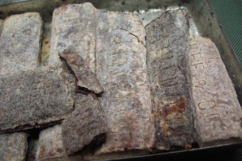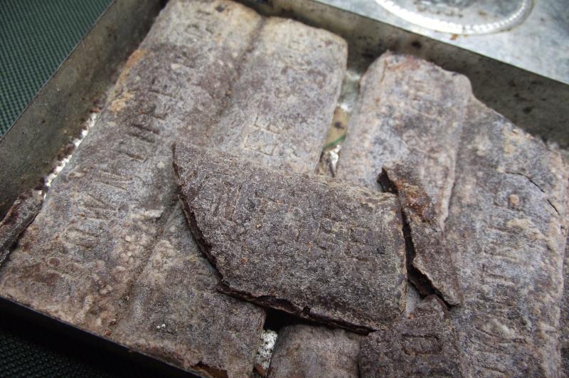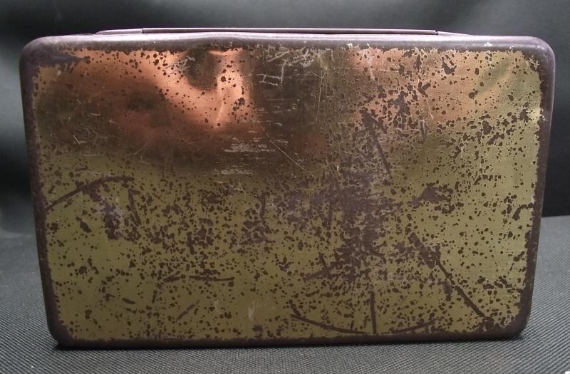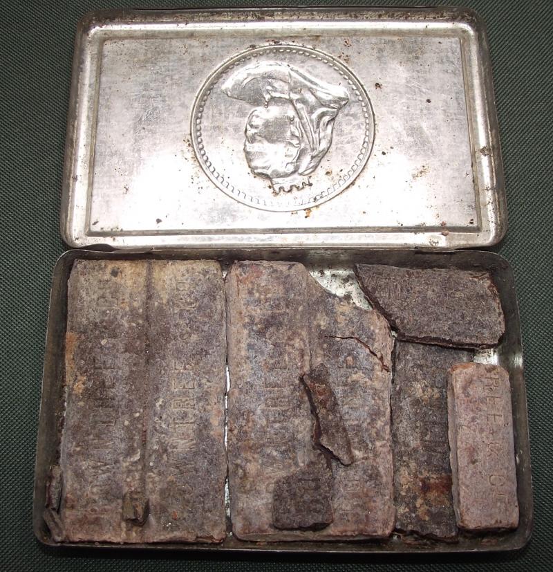 The box has a very nice amount of its period finish to the lid, lets say close to 95%. The sides have lost most of the guilt finish to the sides but has most to the bottom. Lid fits tightly. The inside has what looks like all its contents but the chocolate has cracked and some are in bits, two are complete. The bars still smell of chocolate but i would not be silly enough to try one folks!
