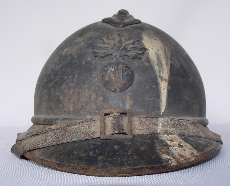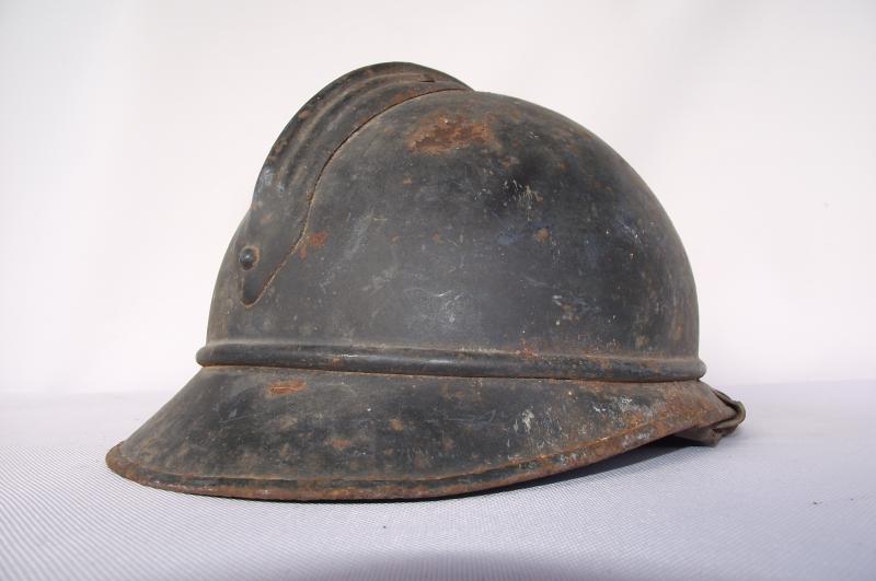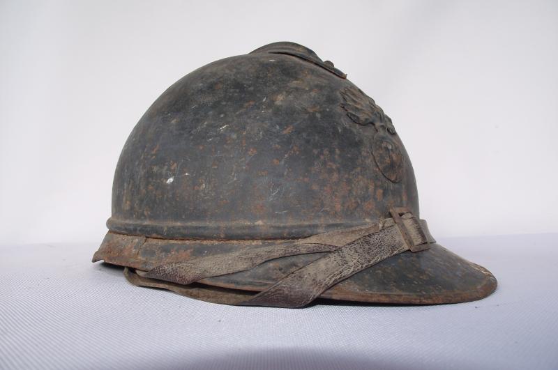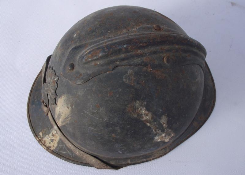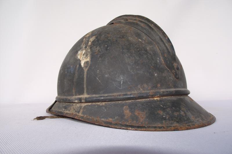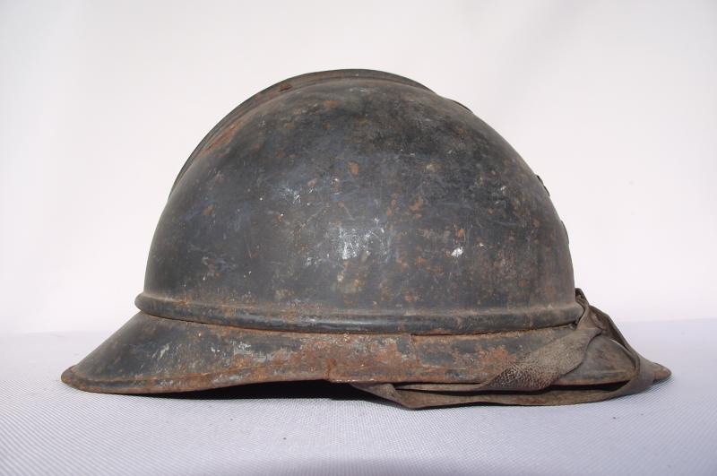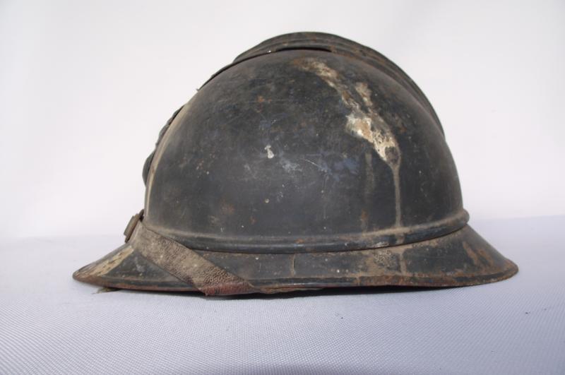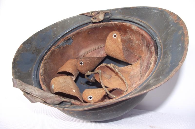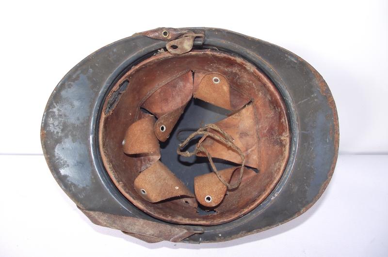 As found hanging up in a local French barn this one has a very nice amount of its later over paint on top of the early horizon blue finish. As you can see there is slight rust bleed mainly to the rim and a couple of good bird droppings, not to worry as if wishing this will clean up nicely. The inside has its complete supple liner with one rodent bite and coming loose from one of the side liner retaining pins. Comes complete with its period chinstrap, one end coming loose from the rivet. If wanting a barn find example then you cant go wrong with this example and im sure with a little soapy warm water the finish will clean up nicely!