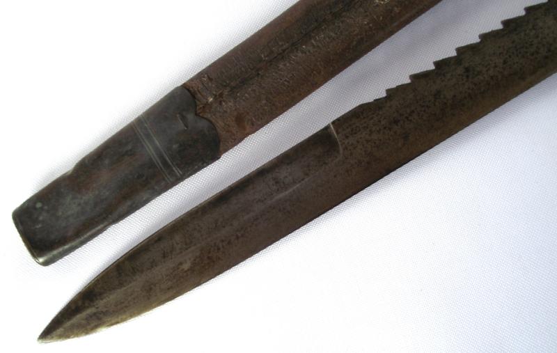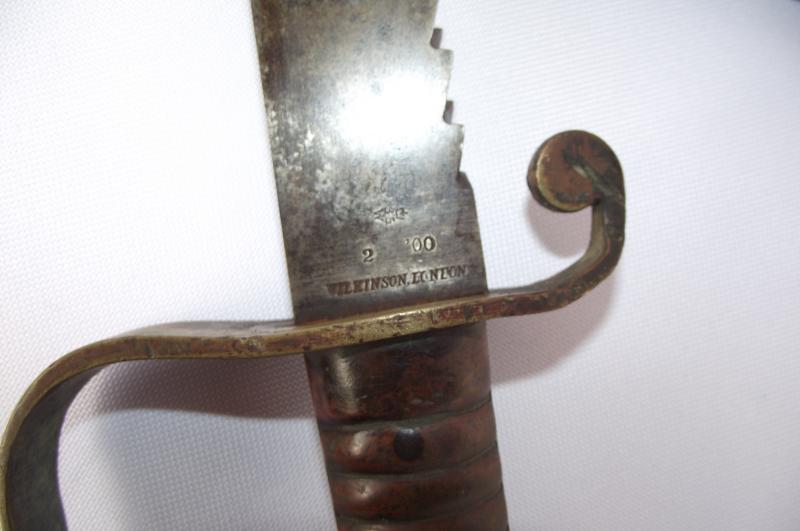 A really nice untouched example with the blade having a good amount of staining but no pitting into the blade surface. The cutting edge has some minor sharpening looking to be period done. The blade on one side under the cross guard is stamped to the Wilkinson firm, London with month stamp ''2'' and date stamp ''00''. The brass cross guard has had a minor knock with the same date stamp ''00''. Brass handle is in nice condition with its 4 rivets. The period leather scabbard has supple leather and tight stitching, the top surface finish has crazed revealing the brown leather underneath. Bottom chape is solid with a couple of knocks. Top chape again fixed solid to the leather is month stamped''12'' and date stamped''1897''. Dates would make it a sound candidate for use in the Boer War. Years ago a good amount of these sawbacks where found and you can find them for sale on the internet with heavy cleaned brass handles, buffed blades and refinished scabbard leather. What we have here is a completely untouched example.