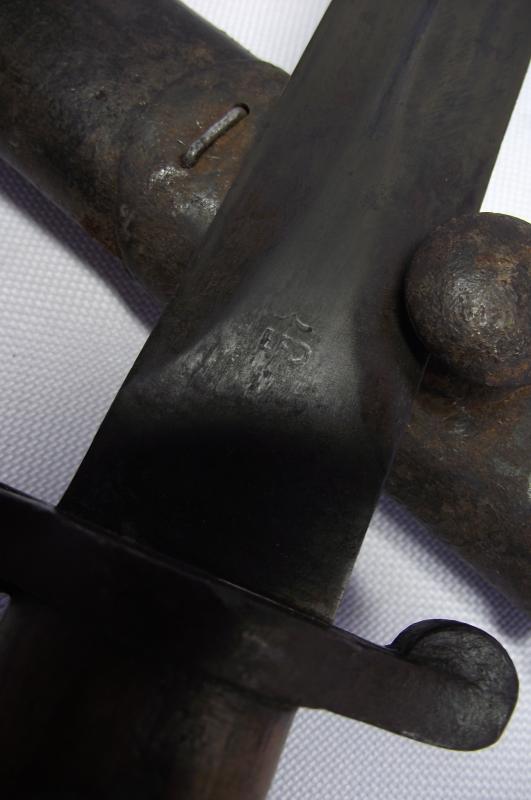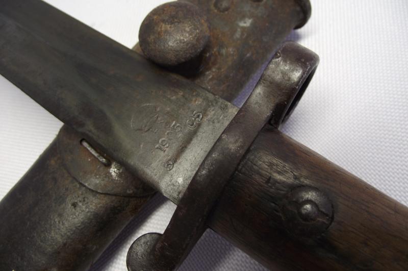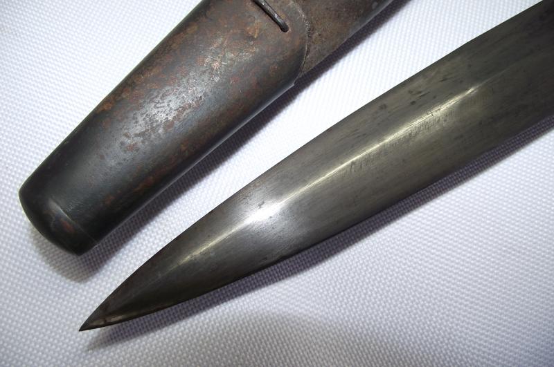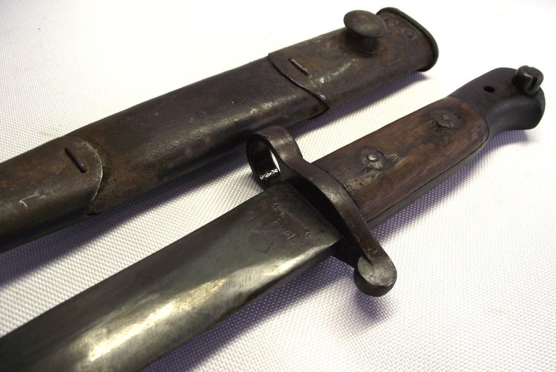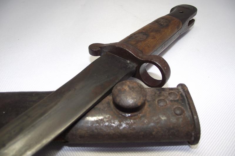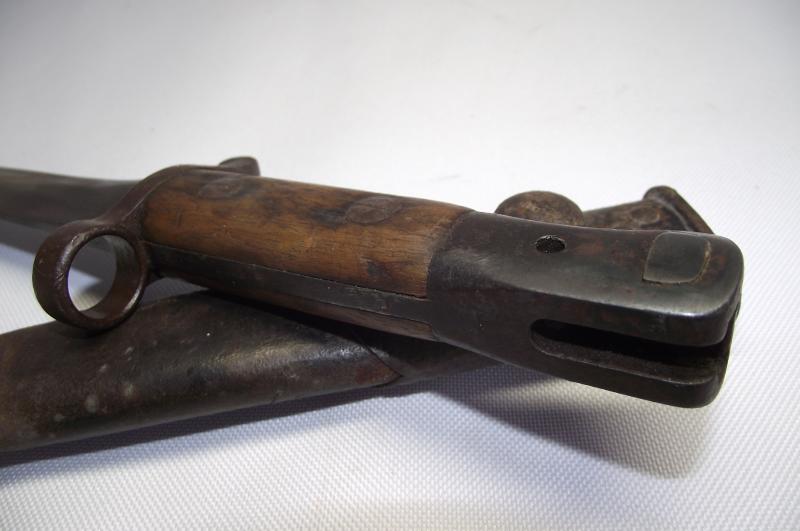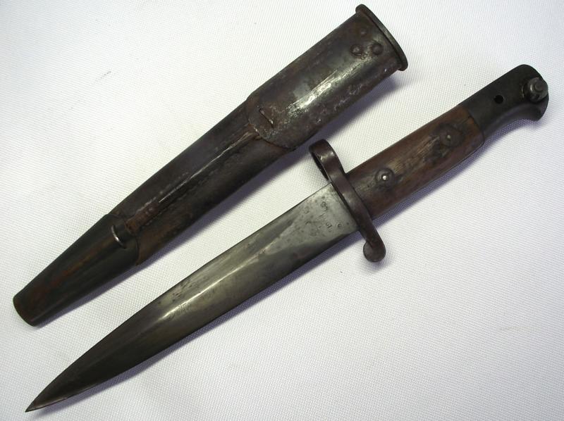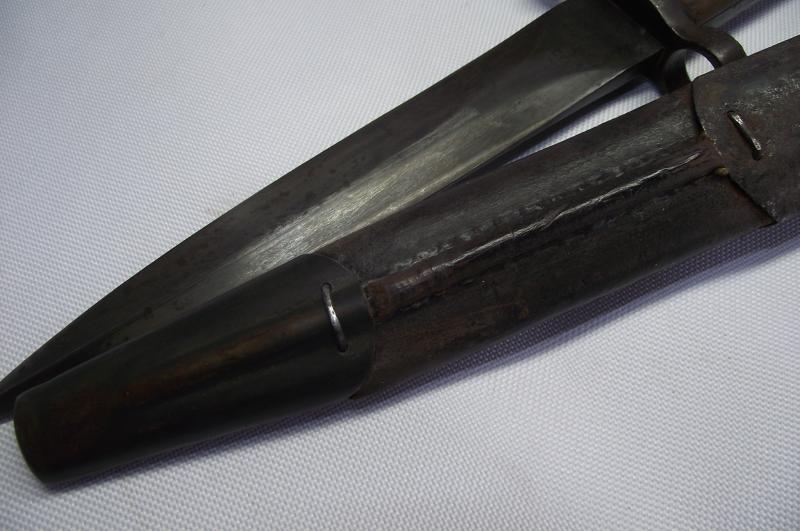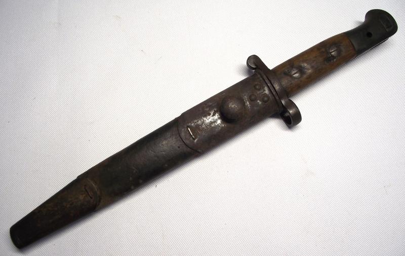 Scarce example fighting knife converted from a 1905 dated 03 pattern bayonet, The condition is very nice with the blade having no pitting and a very sharp point, clear markings to both sides. The cross guard and pommel have taken on a very nice dark finish matching the blade , top button works and both wooden slab grips are well used with bruising but no major damage. The cut down scabbard has supple leather with tight stitching. Both metal ends have taken on a nice dark patina with the top end showing evidence of a webbed frog having been present for a number of years, now sadly gone. I may add that the bottom chape is tightly secured to the leather but does bend slightly so i would be careful. According to Ron Flook's book on fighting knives these might well be WW1 conversions but does provide a really nice image of SAS members wearing such knives in the Aegean during WW2.