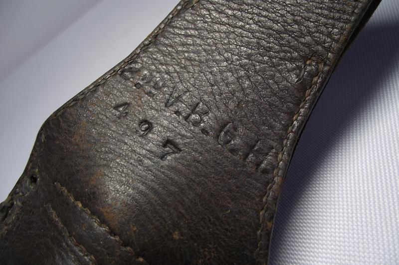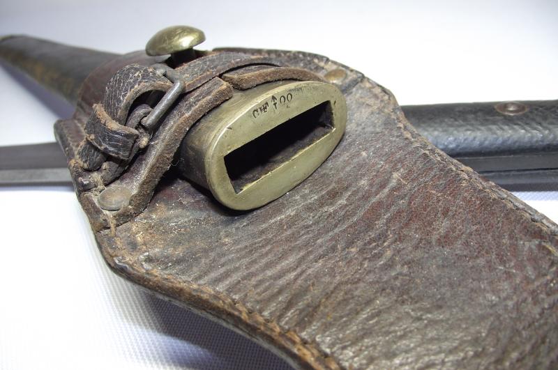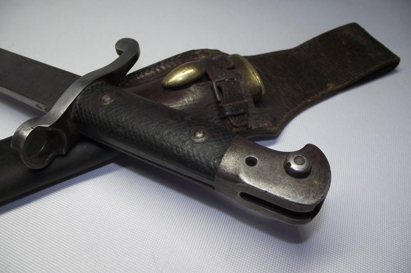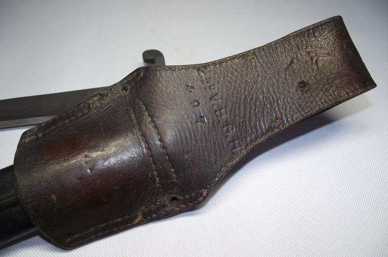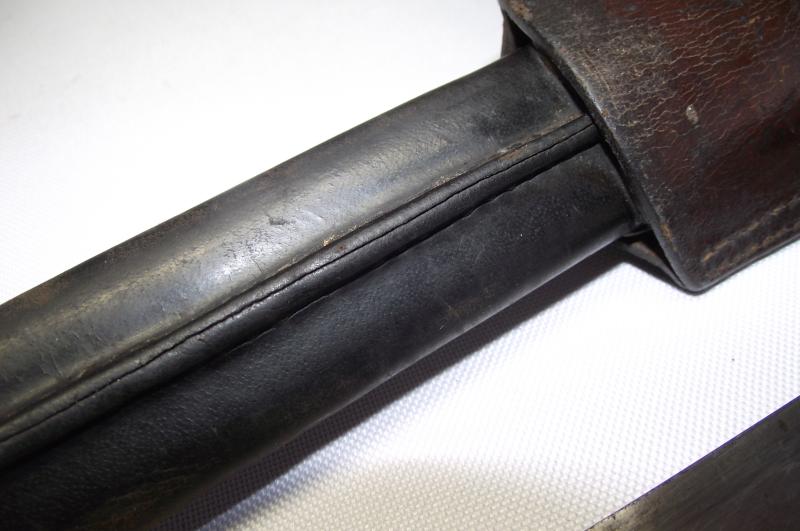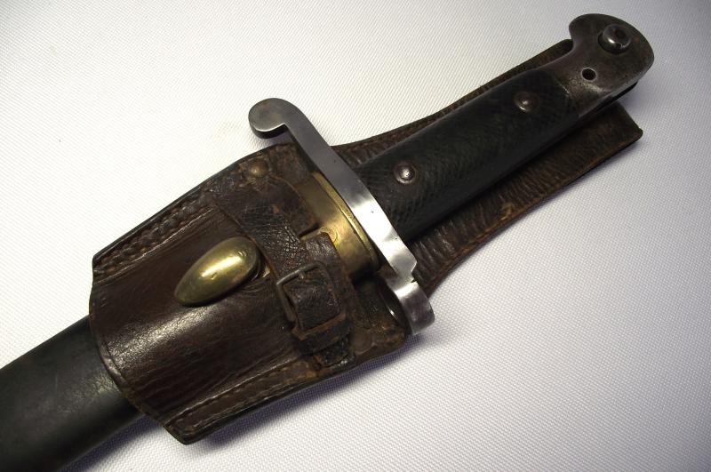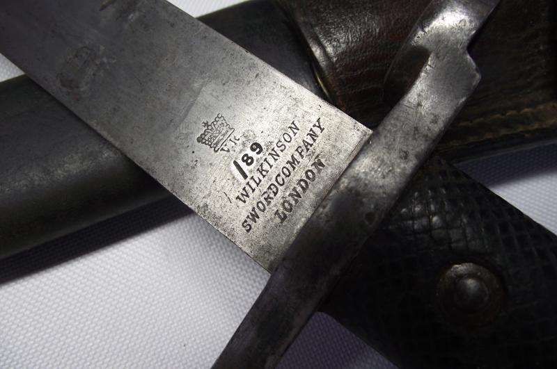 A very nice unit marked Wilkinson manufactured Martini Henry Bayonet and Leather Frog. The blade has minimal staining and one tiny water mark from the blade resting against the inside scabbard runner for such a long time. Blade has its factory edge with clear markings found to both sides. The date is 1889 so would fit in nice with the Boer War period and the 2nd battalion served in a number of actions during its service in South Africa. The cross guard and pommel again with minimal staining , top fixing button works and both leather grip plates are undamaged with just some sharpness gone to the cross hatch from use. The leather scabbard is supple with tight stitching and both brass ends are in fine condition with both having the same date marks. The very nice leather frog again in fine supple condition with a supple fastening cross strap. The back has very nice and clear stamps to the 2nd Volunteer Battalion of the Gordon Highlanders. Even with this bayonet being in such a very nice condition its even better having Volunteer unit marking to ID the Regimental use.