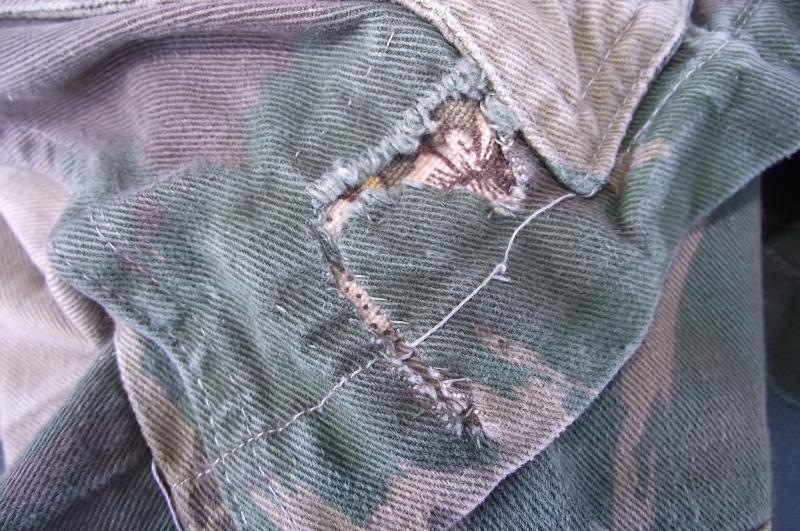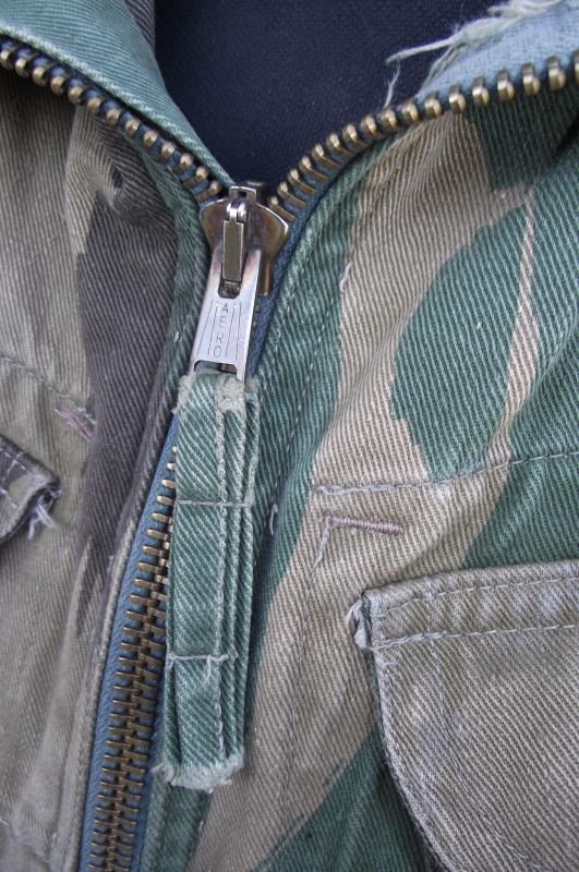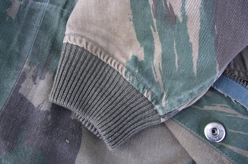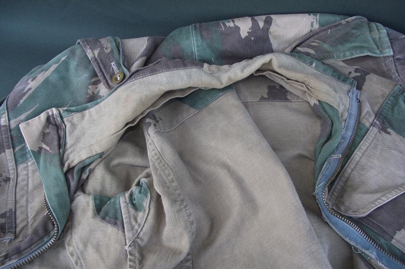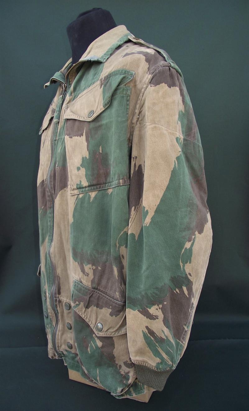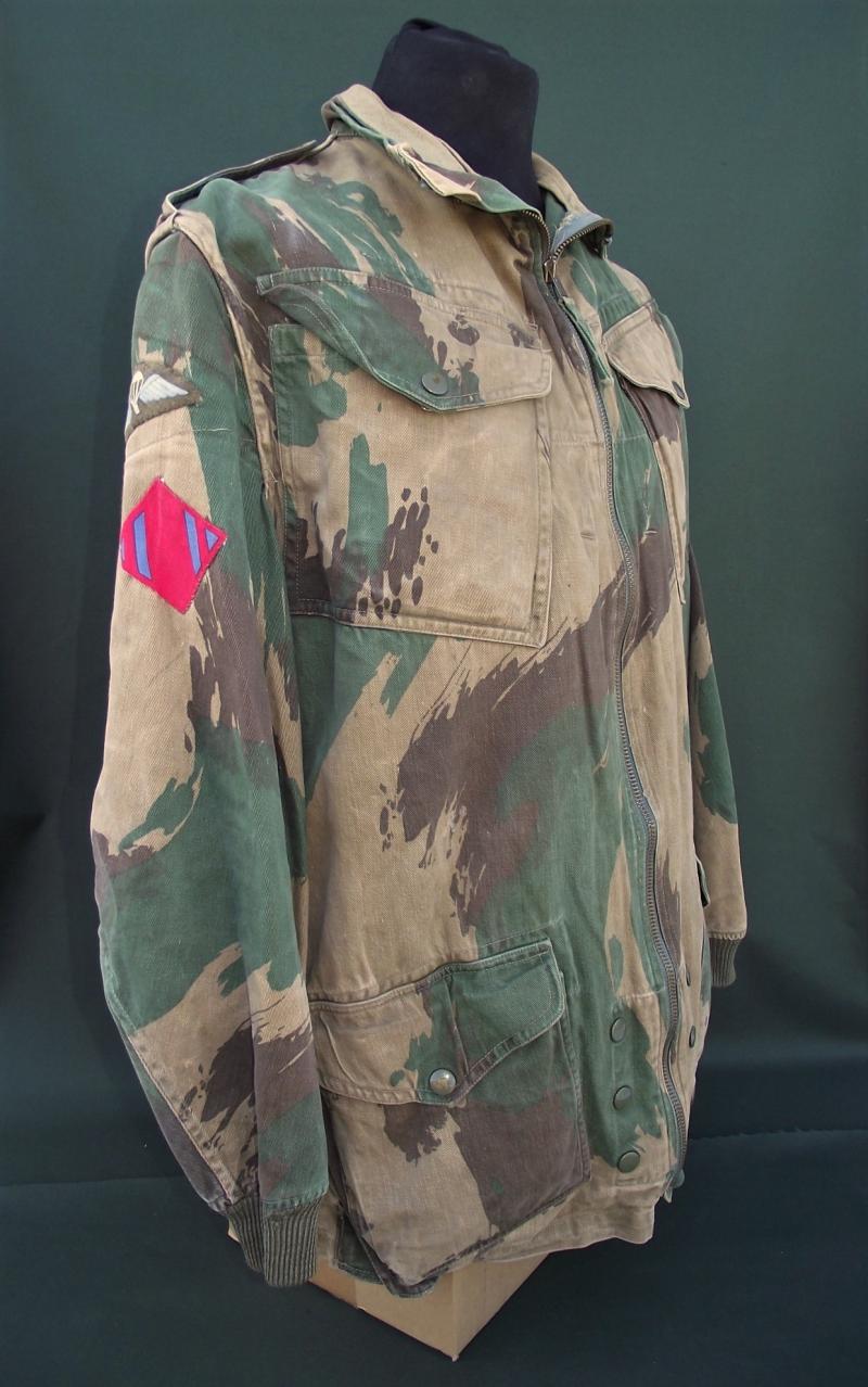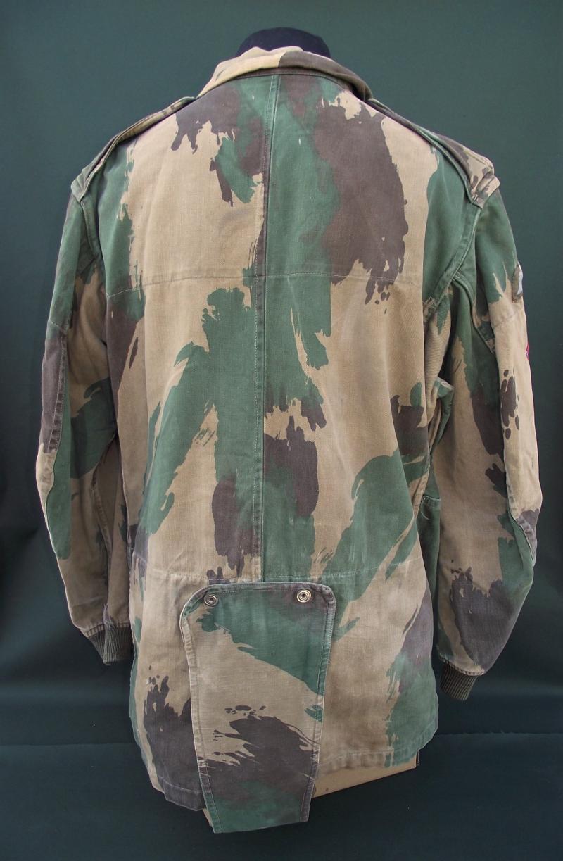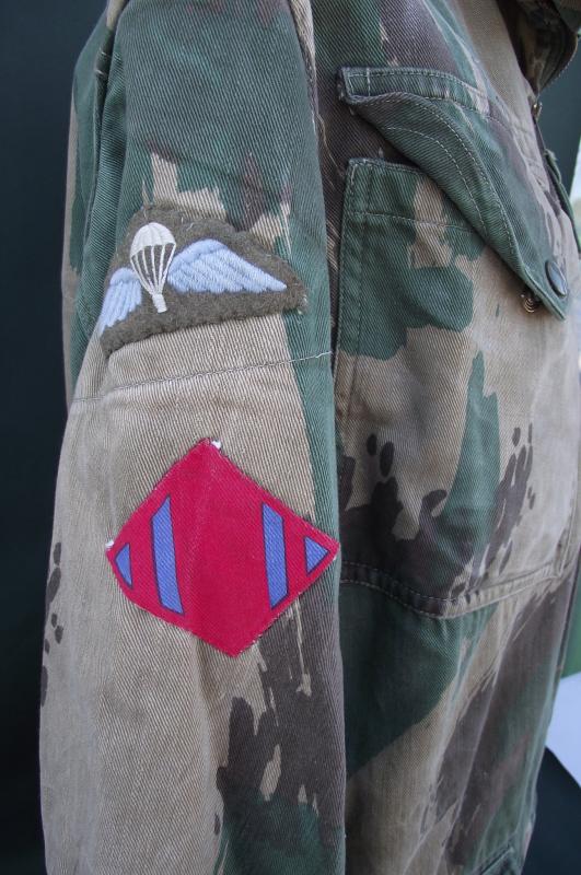 In very nice condition with sharp bright color to the camo pattern. One repair to the bottom side popper repaired with what looks like 1960's curtain or cloth. Zip works fine as do all poppers and the cuffs are fine without moth etc. Inside can be found a slightly washed out but clear cloth label with details. This smock is badged up with wings and a printed DZ flash to the 131 Independent Squadron RE.