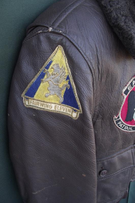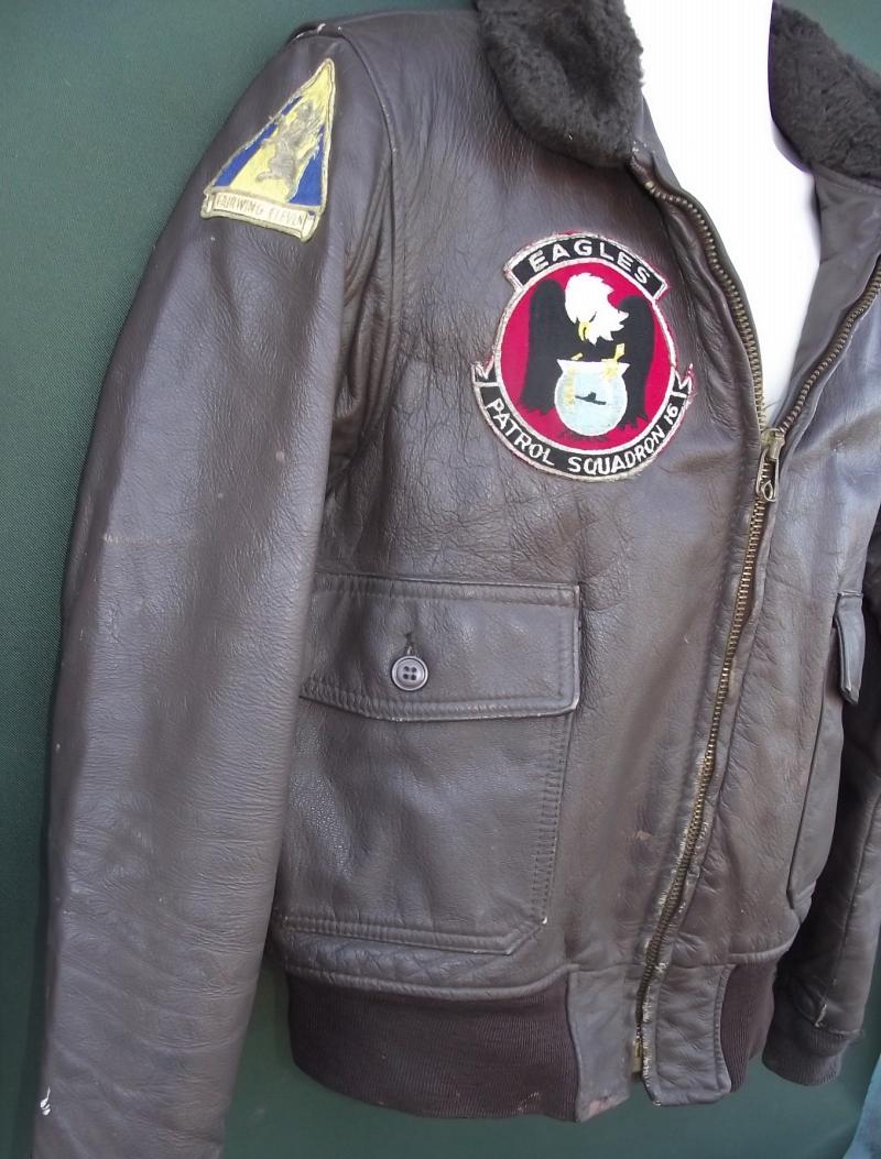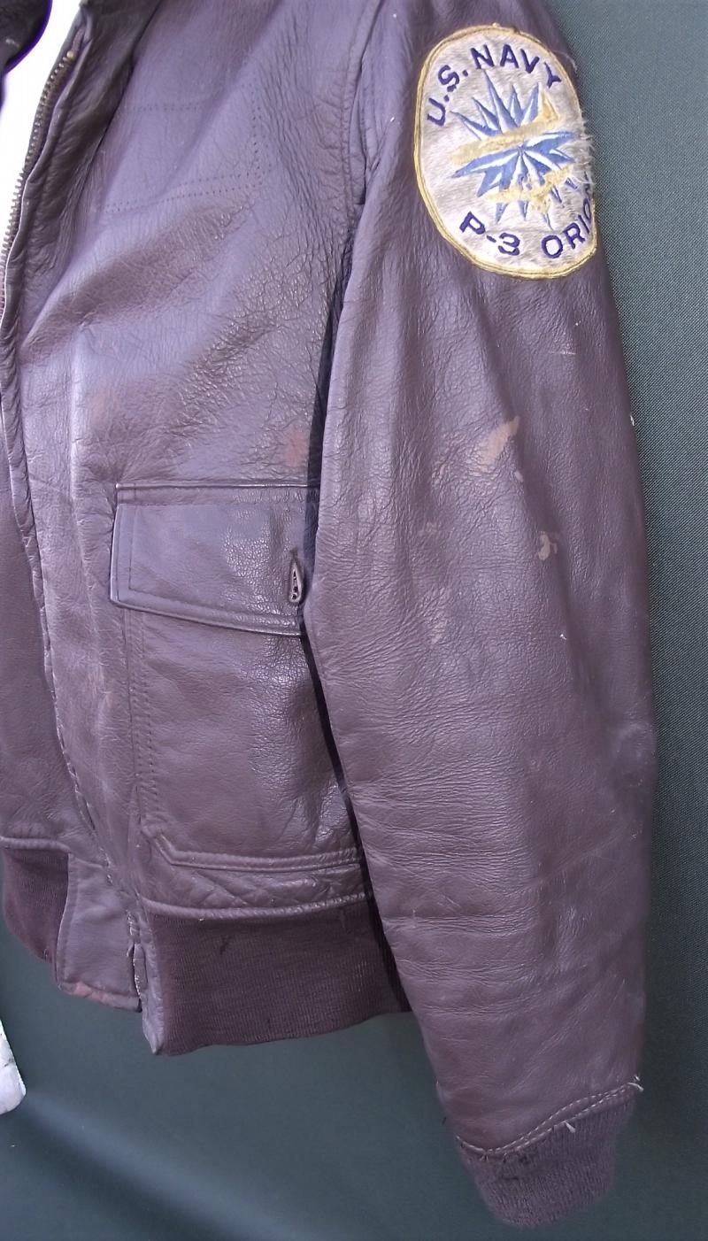 A very nice named G-1 flying jacket badge to the Eagle Patrol Squadron who flew P-3 Orion aircraft in the 60's, name tag found inside one of the pockets. The condition is very nice with supple leather, slight brown paint splashes, easy to remove if wishing, no rips or snags to the leather finish. All buttons present. The cuffs, arm and waist, are still quite tight with only the slightest of moth nips to the waist area, i can count 3, and no nips to the cuffs. Arms have the breathing grommets under the arms, zip works fine. All cloth patches are machine sewn and are in nice clear bright condition with slight wear from jacket usage. The inside lining is complete and clean with a clear makers and designation label to the neck area dating this example to 1969 and giving a nice 44 size as well! Perfect display item or even better a perfect jacket to wear if wishing.