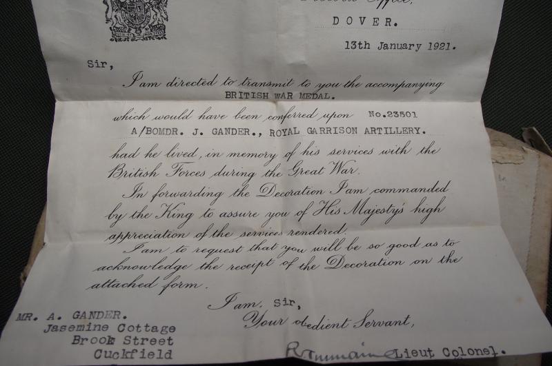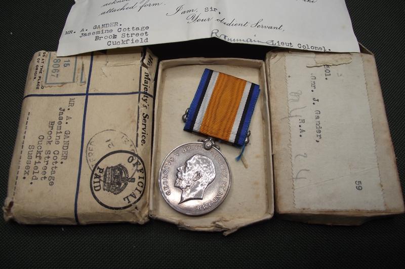 A/BDR Jesse Gander died in India on the 28/12/1915, he was from Sussex. The medal is in very nice condition as is the ribbon, its found in its period medal box and the envelope that was sent to the relatives of Gander. Also comes with its Record Office memorial certificate signed by a Lieut Colonel.
