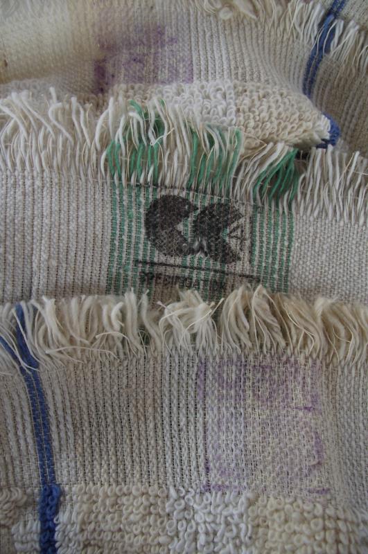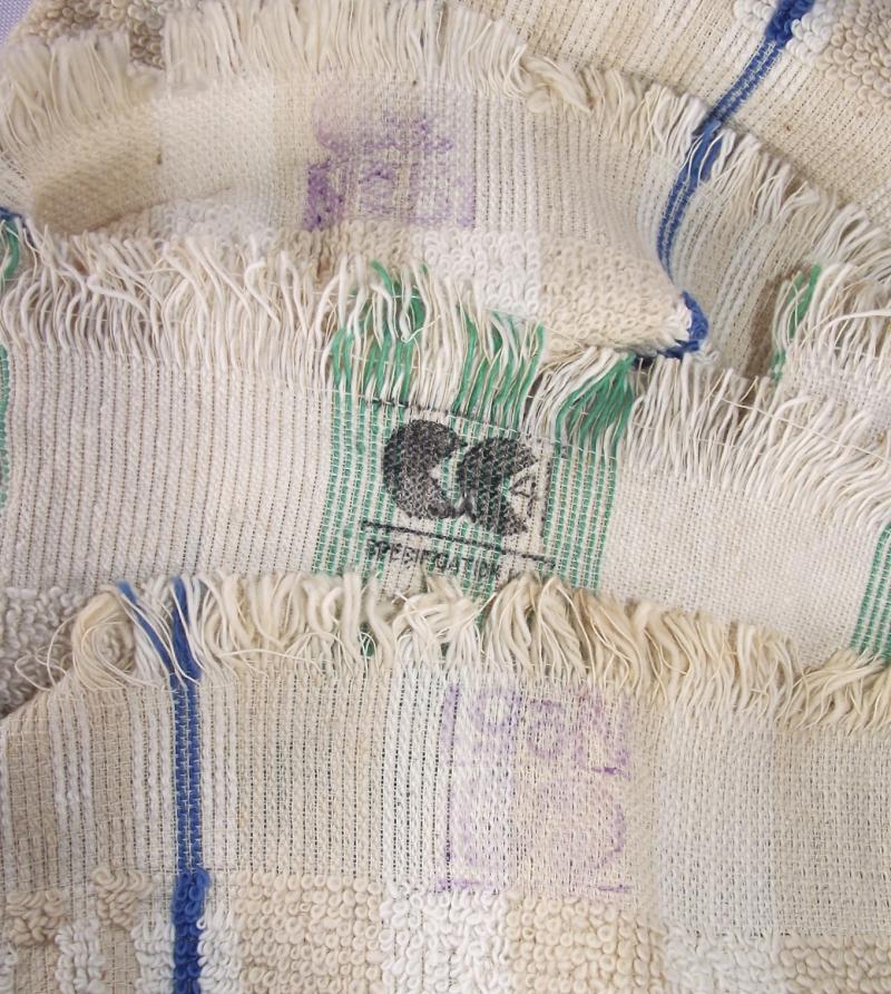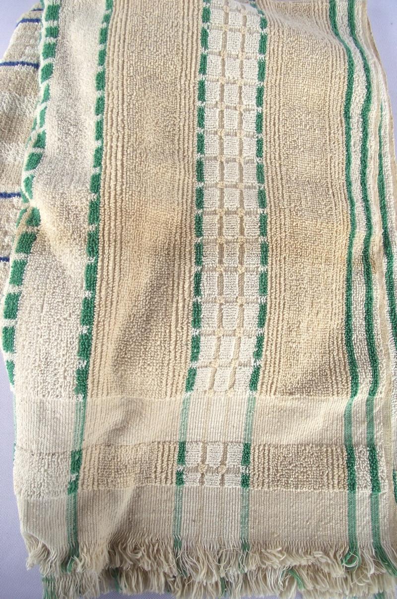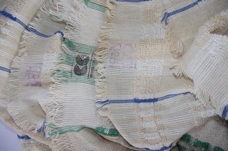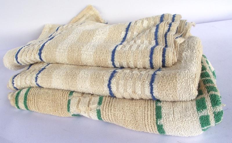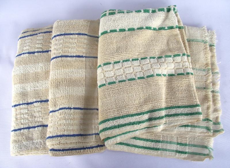 The three towels are in very nice clean condition all having wartime utility stamps. One has a very clear black stamp the other two have weak matching purple utility stamps.