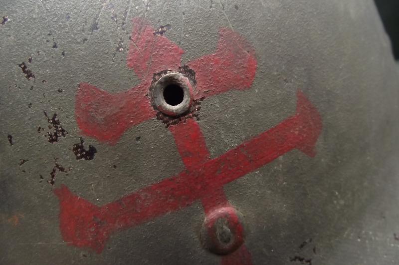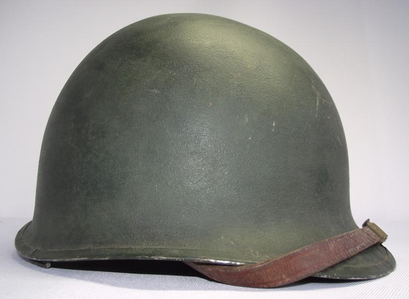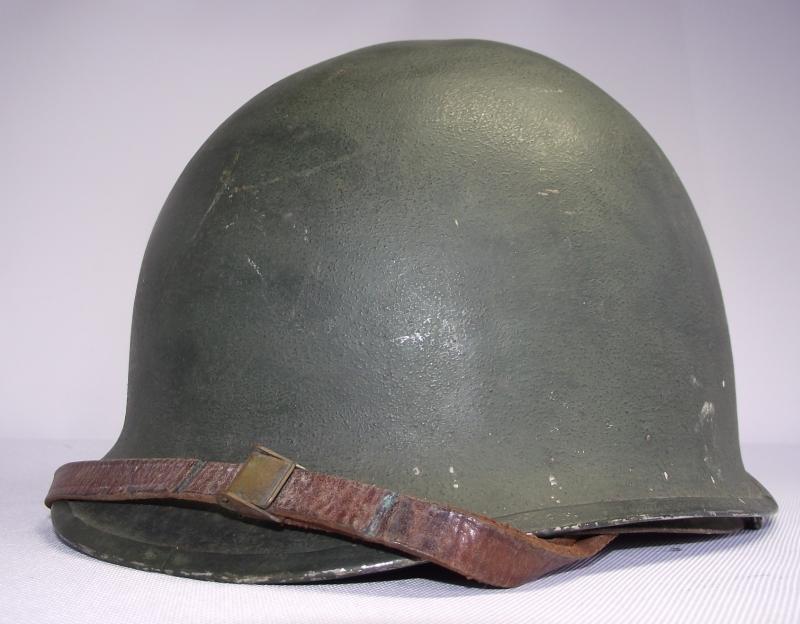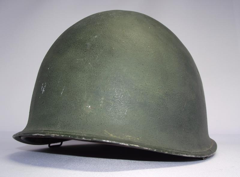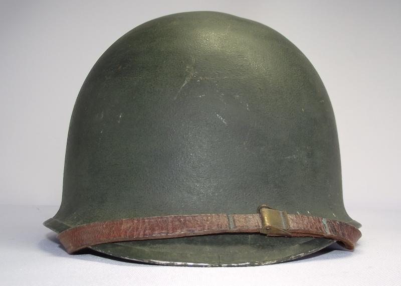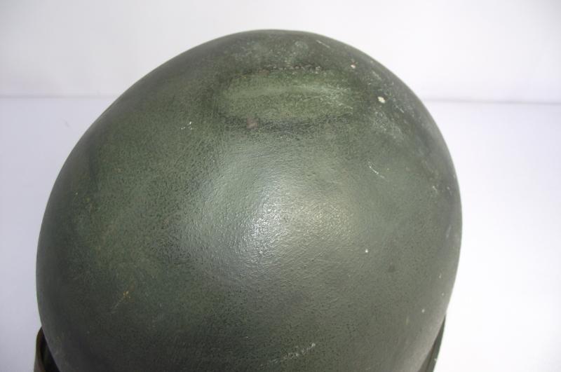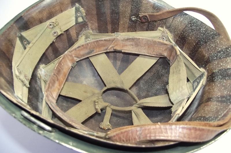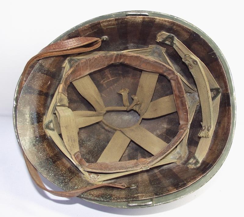 Lets start with the Firestone marked liner as in my opinion its the best bit. It would all seem to correspond to a late 43 or early 44 date of manufacture with steel coated liner washers, trimmed neck suspension band, nape strap without buckle,flat khaki liner tightening lace and the light khaki strapping. The leather chinstrap is in supple condition with all metal components made from brass. The liner is in well used condition with plenty of grease and staining from use, all webbing is still attached to the side rivets. You might notice the well used sweatband is fitted in a backwards position and im leaving ''as is'', the way i found it and to tell the truth does appear to have been in this position for quite some time. There is a faint name to leather of the band but i cannot make it out. The inner has some green paint splatter near the peak. The outer paint finish does have some paint loss as expected from use, no cracks or chips to the body. At some point this liner has had a red Cross of Lorraine hand painted to the front. It has wear consistent with a certain amount of time and use. The steel, fixed bales, front seam shell is again i would suggest dates from 43 to early 44 with a faint heat stamp to the inner front of the shell, i cannot make it out. There is one knock to the crown and the shell still has a very nice amount of its period cork finish. At some point the outside and inside of the shell has had a second coat of dark green finish added. No chinstrap present.