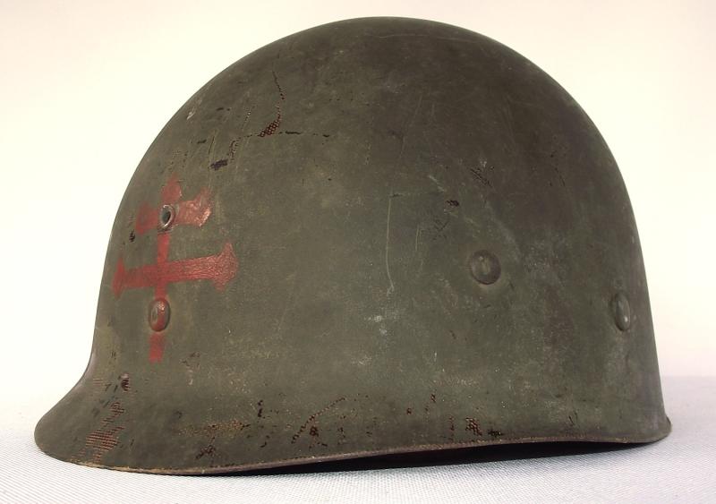 Front Seam, Fixed Bale, M1 Steel Combat Helmet with Cross of Lorraine Liner