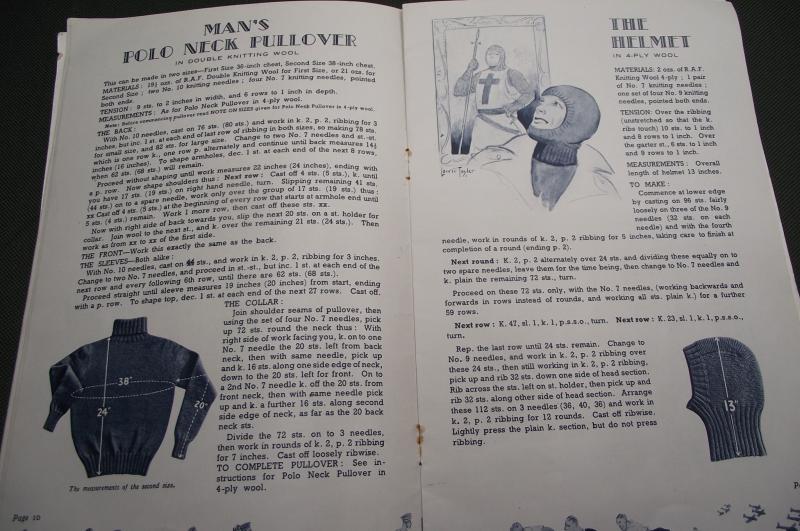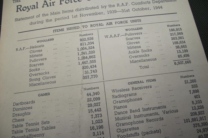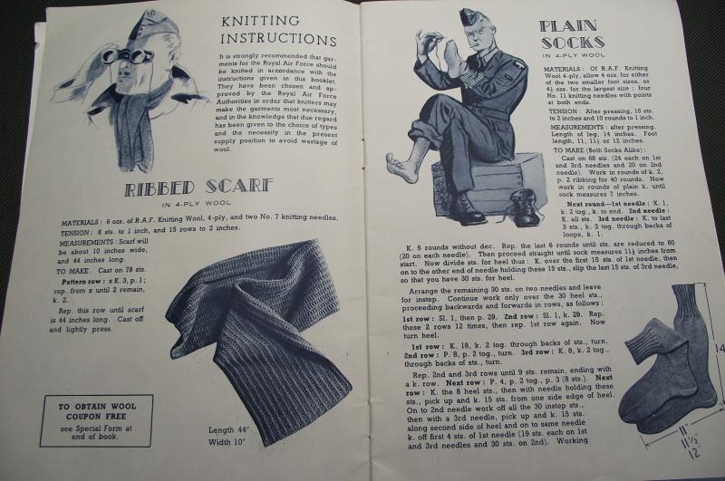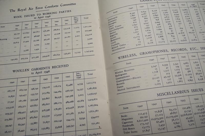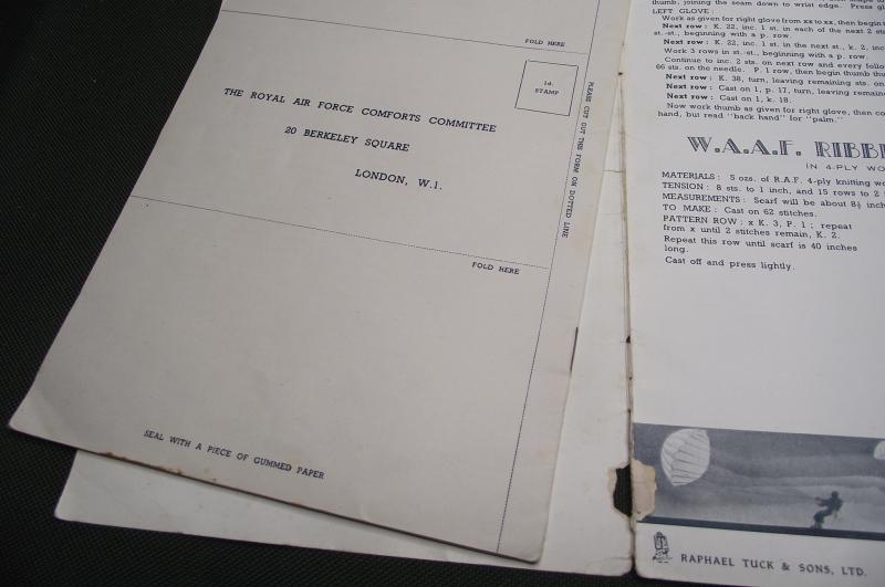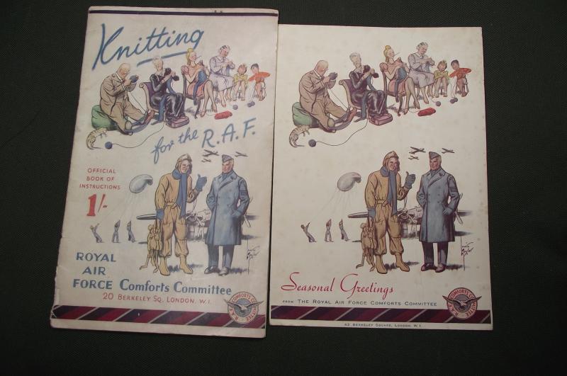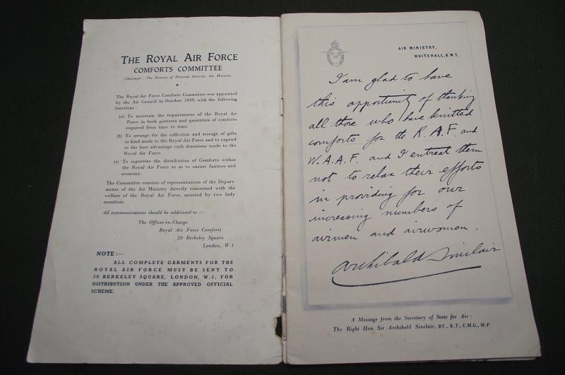 We have the CC official Knitting book instruction booklet, complete but loose front page. A seasonal greetings card with interesting statement of items distributed by the CC from 1919 till 44 on the back and lastly a 1946 survey of the work done by the RAF comforts committee with 25 pages of all work done by the organisation during the war, again some interesting information. Just the type of brochure's found in a household busy working and knitting for the Comforts Committee during the war and as this set came from a local house in Cardiff where 6 sons did service in the military its no surprise.