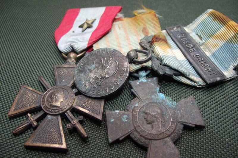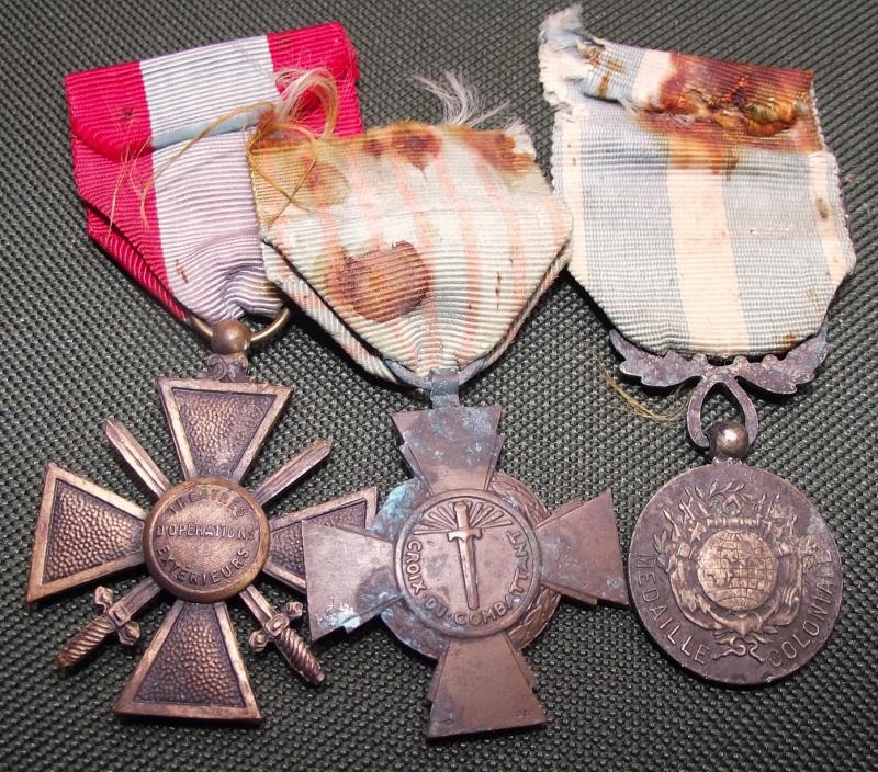 This little set consists of the Exterior Theater Croix de Guerre, Extreme Orient Service medal and a French Combatants Cross. All would appear to have been sat in a box for years showing plenty of verdigris etc.