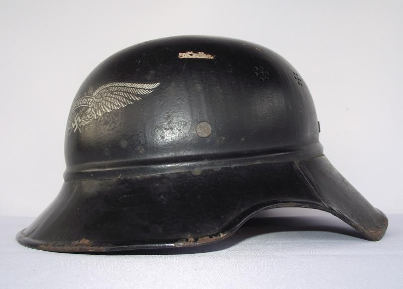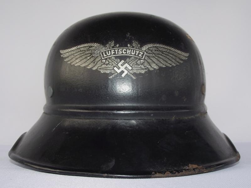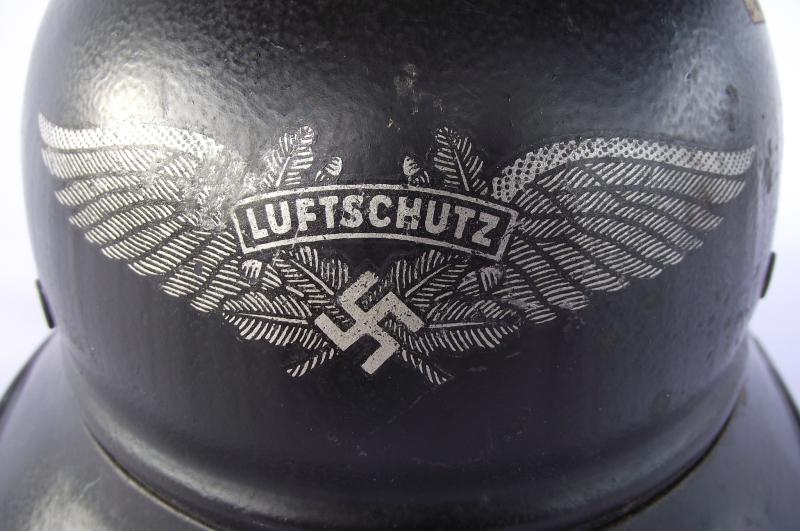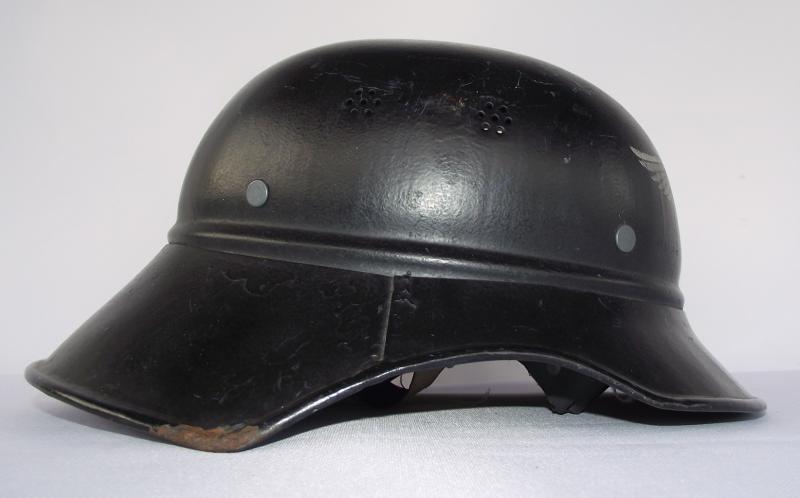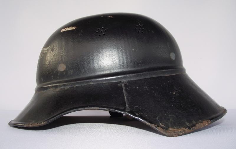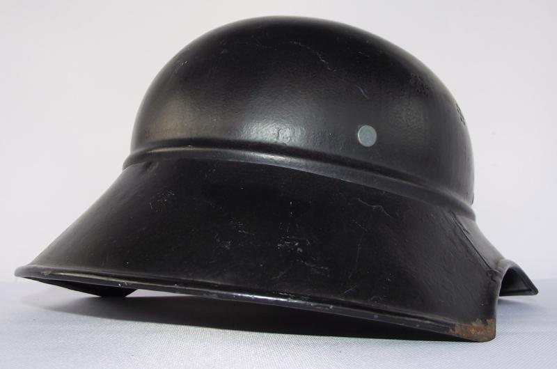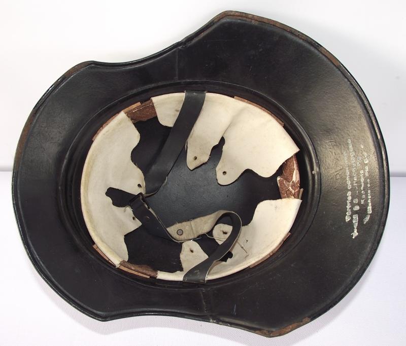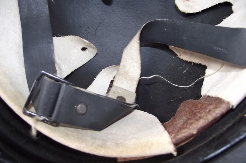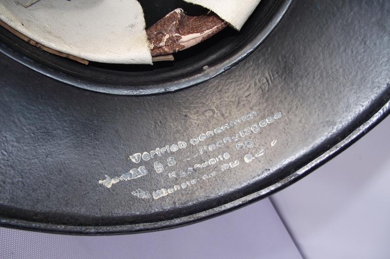 This particular helmet has at some point gone back to the factory, striped of components and refinished in black with the addition of a very late war fabric liner and vinyl coated fabric chinstrap. The finished helmet received a new decal with inside rear instruction label stamped in white paint. The liner system with card frame has been riveted in place surviving in nice clean condition, all liner pin heads used are without factory paint finish. The overall finish with decal are close to 100% complete. The helmet shouts out late war ''utility'' manufacture.