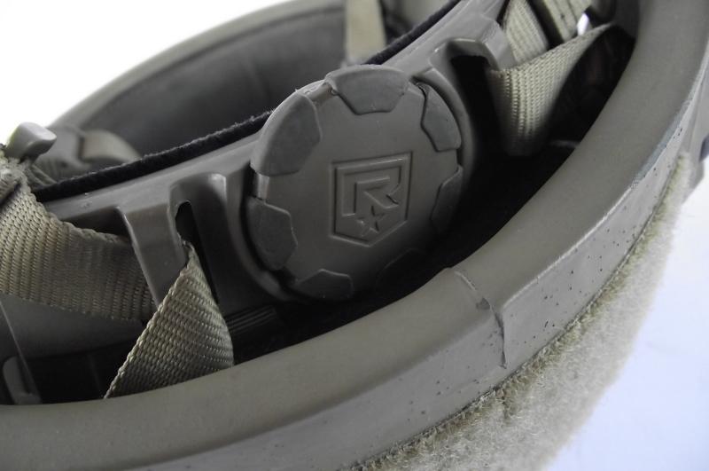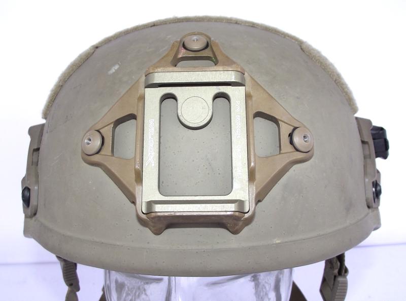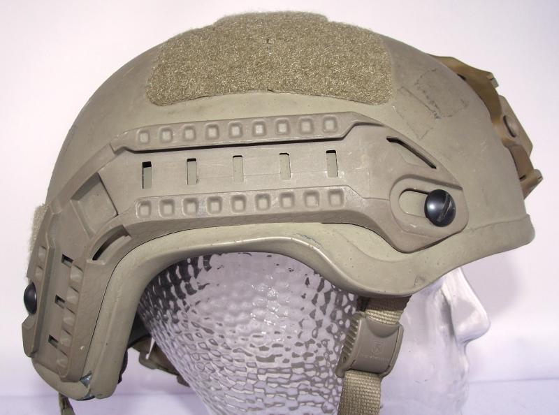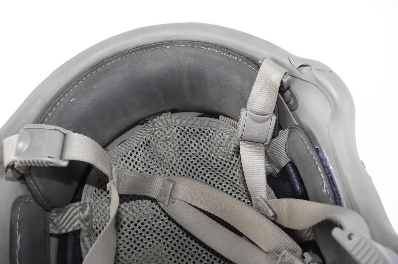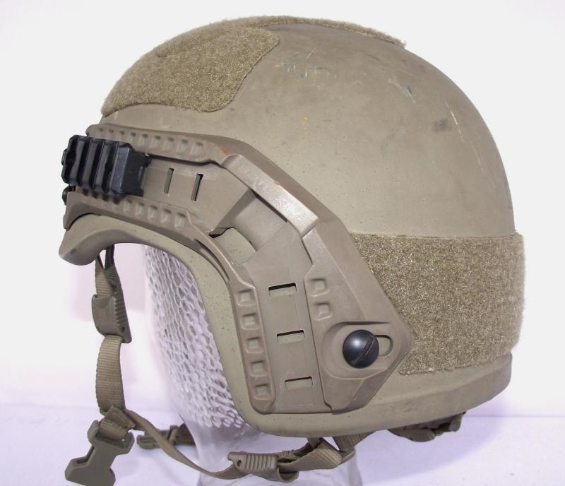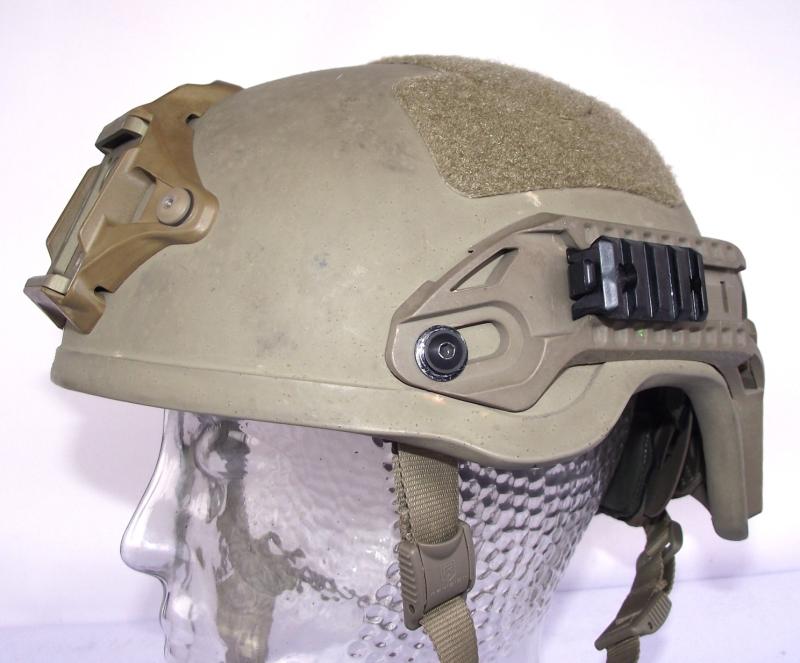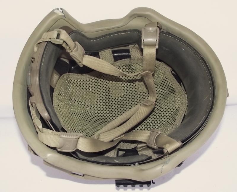 Nice used helmet with just a couple of small cracks to the outer rims on two corners, and some minor scuff marks to the outer shell as expected from a used example. Lots of Revision marks, chinstrap, back neck brace and label to the inside. Front NV mount marked Wilcox. Both side rails are marked Batlskin. Size marked on inside label "LG" for large.