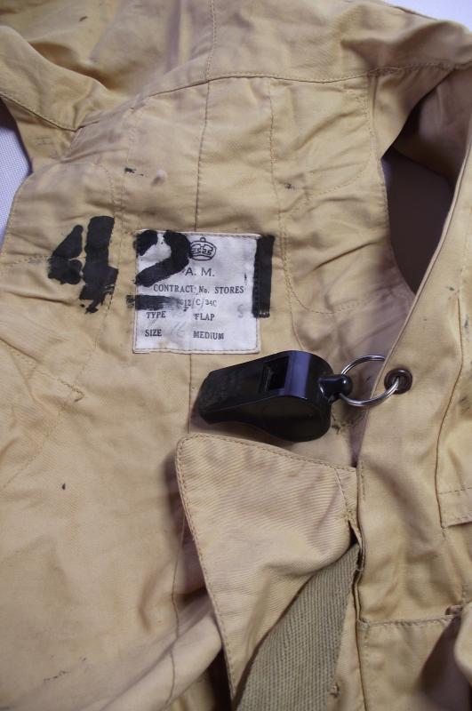 This early 41 pattern Mae West has stamped to the inside label ''Flap Type'' , either the flap has been removed or was never added as these flaps where thought to hinder pilots when escaping the cockpit in an emergency or when ditching into the sea as the flap might get wrapped around the head resulting in the drowning of the crew member. The condition is very good with slight storage marks and minor ink spotting from the stenciled numbers to the inside. Both grab handles are present as are all the period buttons and leg straps. Back neck zip is ''AM'' marked and fully working. Nothing missing from this period example. This item was recently found in an old collection, the pocket snaps have not been opened in years, the material is not pulled, im not going to try and open then leaving this to the new owner if they wish to try! There is a plastic Acme Whistle hanging from the Whistle loop, not sure its period neither is the old time collector, its as he found it many years ago and its as you find it now. Here's a chance to add a rather scarce RAF item to your collection.