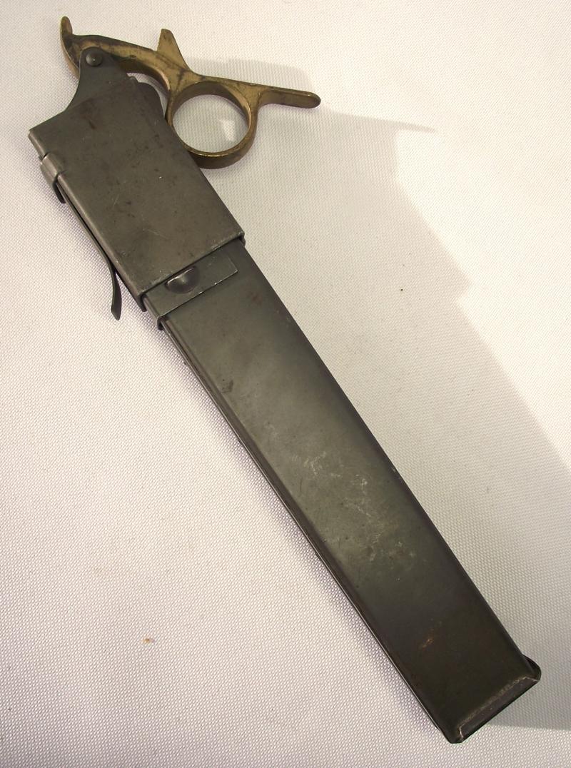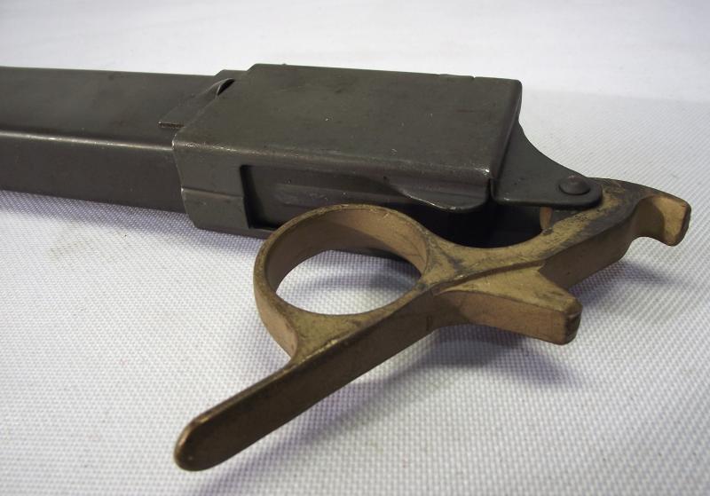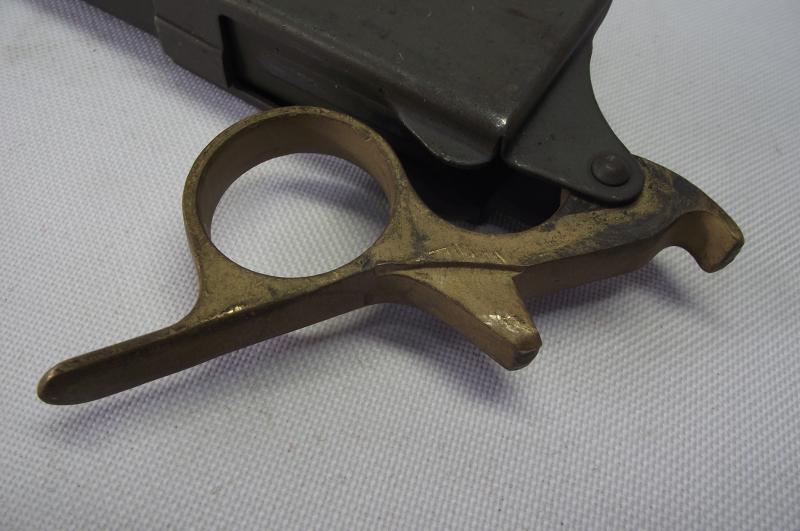 The E&Co marked loader has close all its period parkerized finish to the body and flat gold finish to the finger ring adaptor. I have managed to find a really nice WW2 sten magazine with an almost exact parkerized finish just to finish the set off. Believe it or not there is a British dealer selling these scarce parkerized magazines for £100's each.