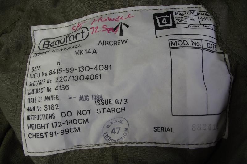 Named 1980's RAF Aircrew Coverall, MK14A with Emergency Knife, Whistle and Dog Tag. 72 Squadron.