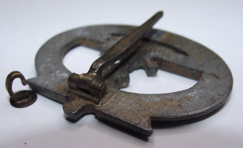 Early zinc manufactured award with sharp detail and some finish remaining. The rear does have its period hardware but the bottom catch has come adrift. I could myself repair it but would not be a satisfactory job imho! This is in need of a good restoration that will do the badge justice. Its my opinion the catch was not secured enough during manufacture as seen by the remains of the fixing solder on the back of the badge and the slight bleed of the gold wash getting just under the catch. So a cheap alternative to what was a £300 example.