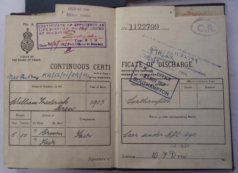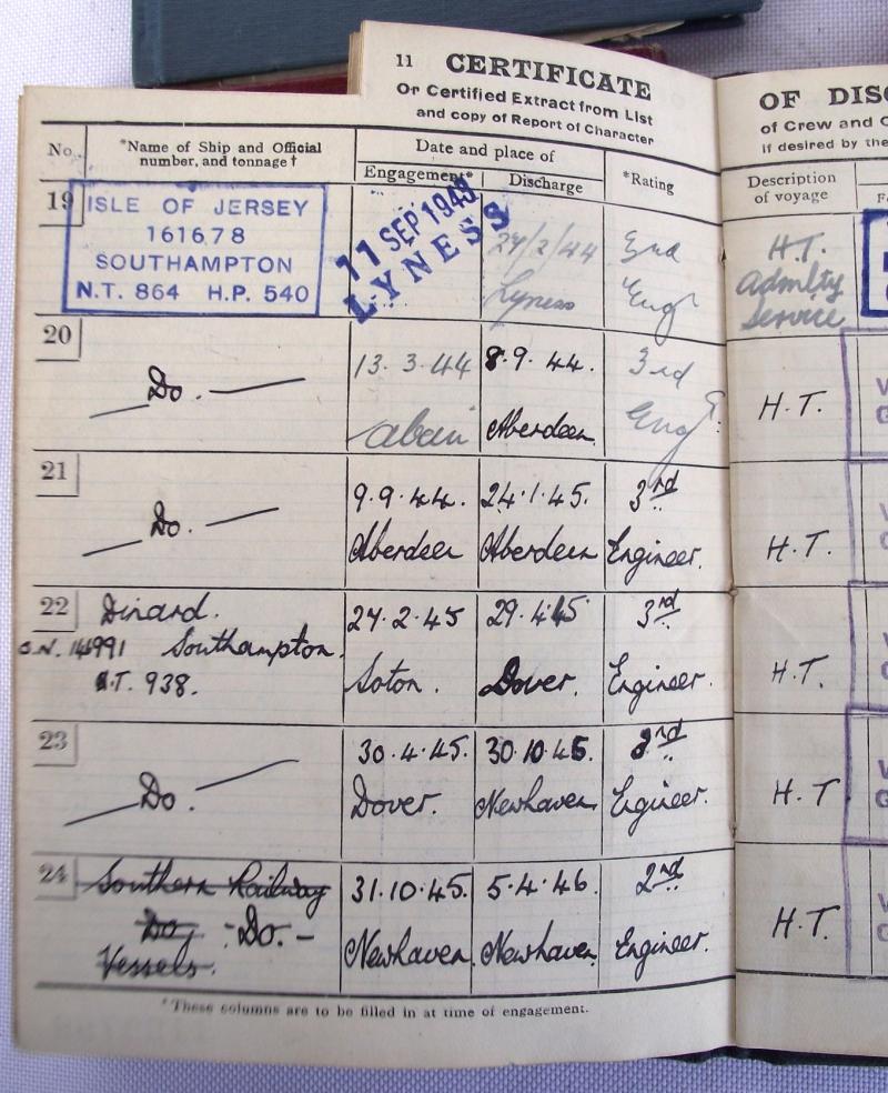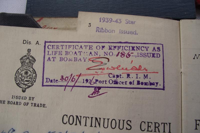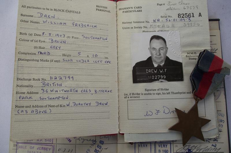 This group turned up just before Christmas from a house clearance in the Newport area. The documents relate to a seaman who started his naval career in 1925 until his last ship in 1965. Of interest are the details of his wartime service on the troopship Isle of Jersey from 1941 to 45, this would include the trip on the 8th of June 1944 to Sword Beach during the Normandy landings. Also found stamped to the inside cover is his entitlement to the 1939-45 star, found amongst the grouping.