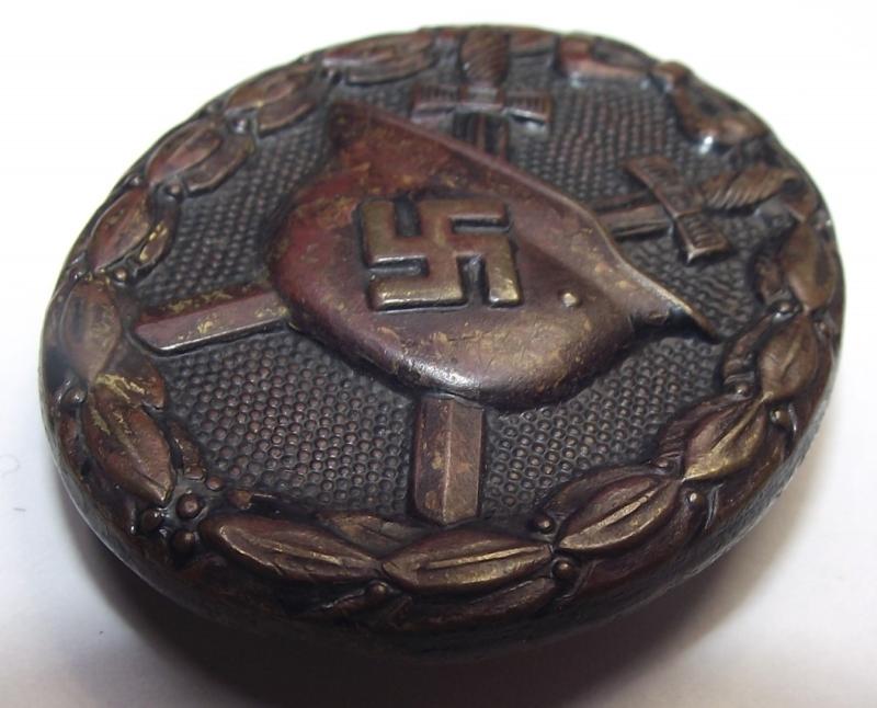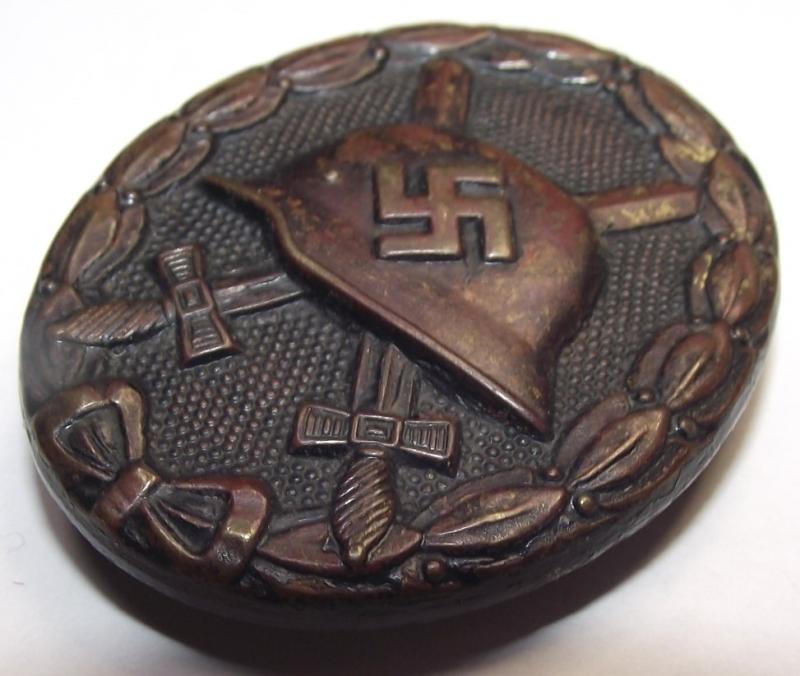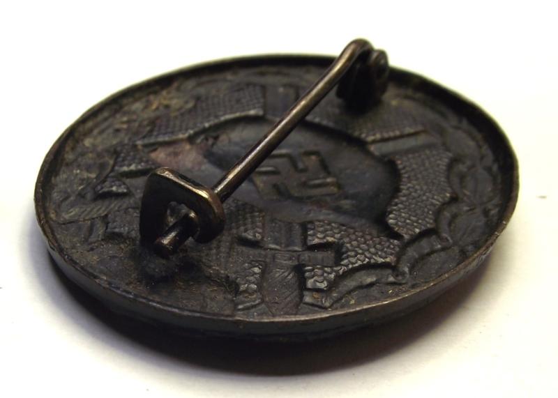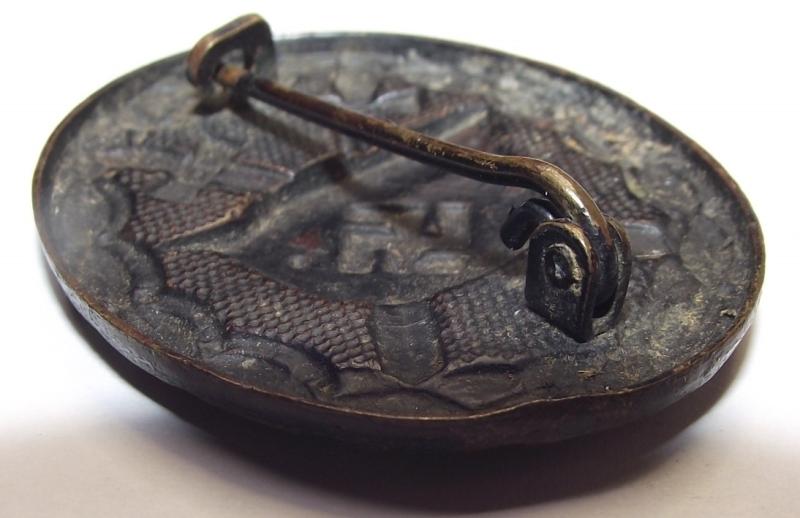 Nice unmarked brass manufactured wound badge with a very dark toned front with some of its black finish showing through, especially to the background dot pattern. The rear has its period hardware. This is an example of whats called the ''no rivet'', notice the back of the helmet and does appear, to my eyes anyway, to resemble badges made by the firm Carl Poellath.