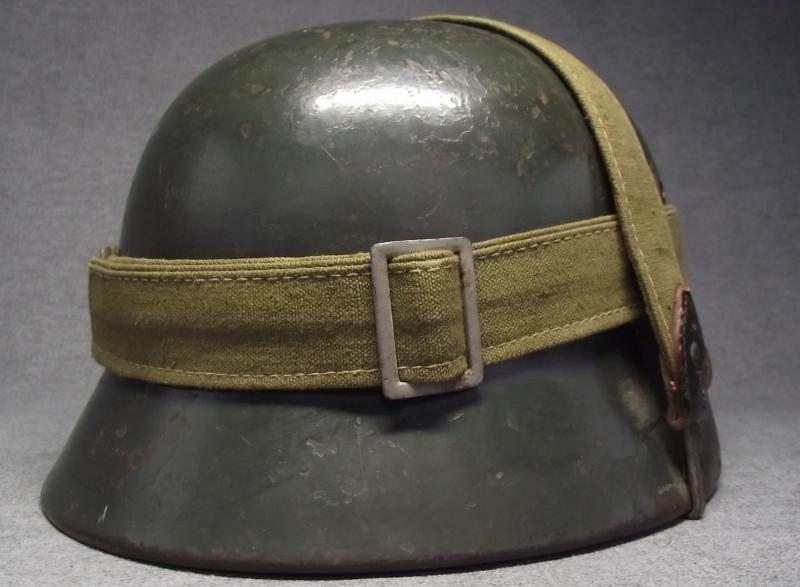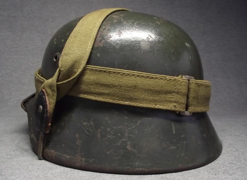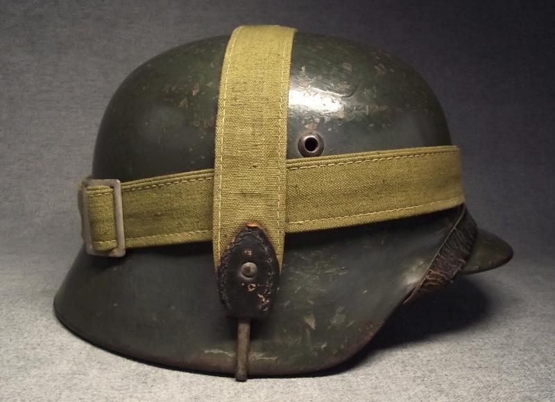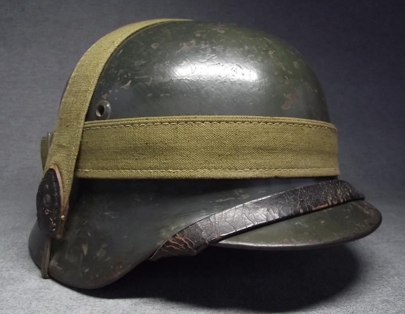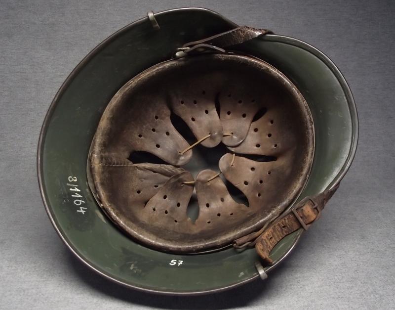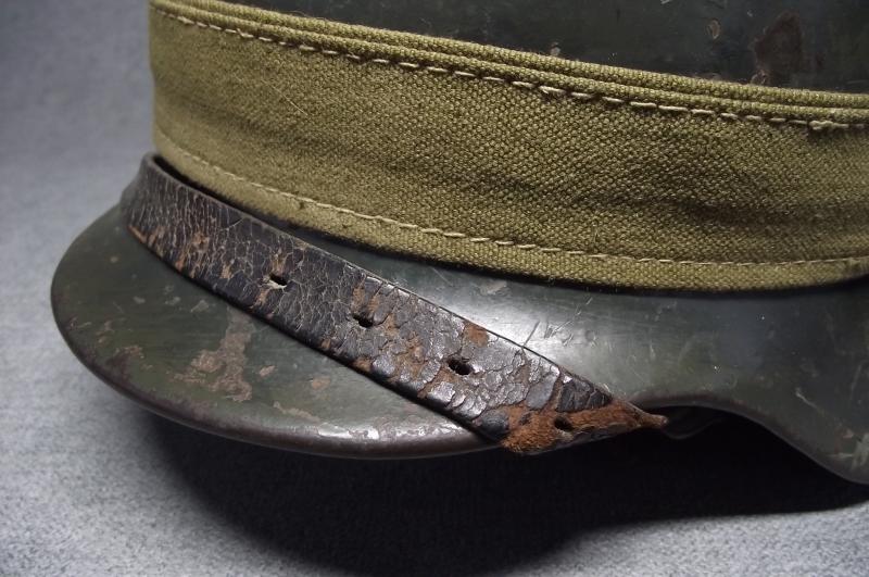 The ET 64 marked shell has had at least three coats of different applications of paint. The last application is dark green, seen better to the inside photos where the soldiers post number is applied on top. This dark green appears to have been brushed on mainly around the outside peak and along the middle of the shell with some brush strokes going up towards the crown, lots of wear to this and the other older paint finishes. All three liner pins have this dark green finish. The National decal was removed at some point, 1940 regulations, with the Heer decal painted over. At some point i would suggest some one has taken a peak under the paint looking for the decal! The zinc banded liner is the period example used during its reissue with dark supple leather and its period liner string. All liner pins are tight. This comes with its period chinstrap thats missing its tip. This example when found had the dated bread bag strap in place and i have decided to sell as is. This example is an very nice ''entry level'' lid that might well be called a camo with the darker green brush application. Without the collector ''peekin'' for the Heer decal this example this IMHO would cost a lot more folks!