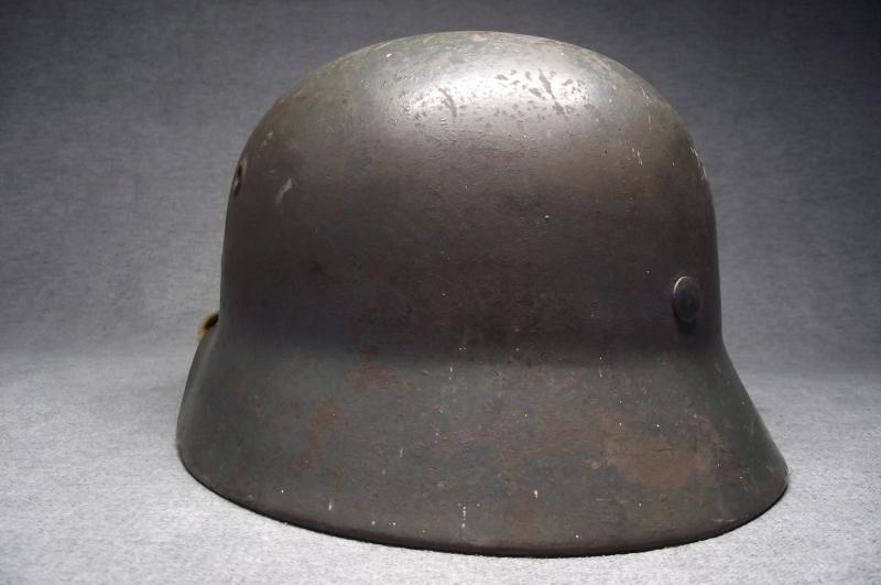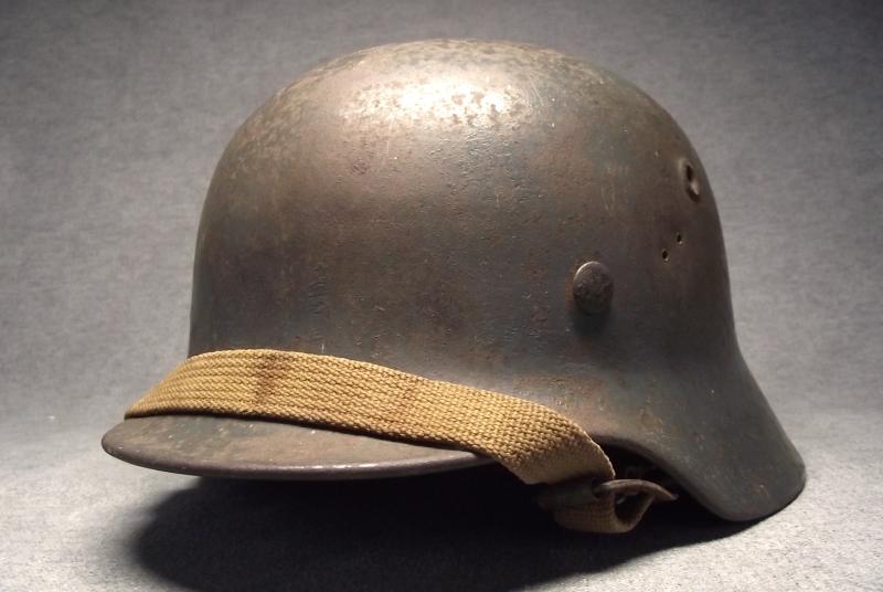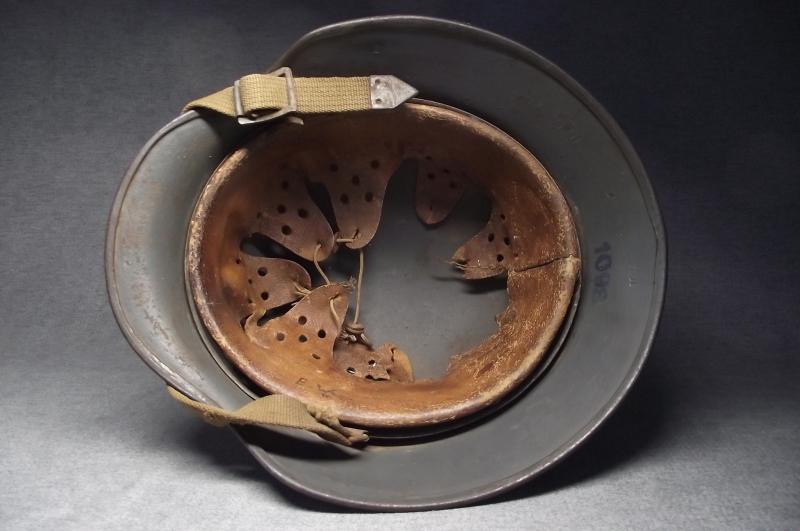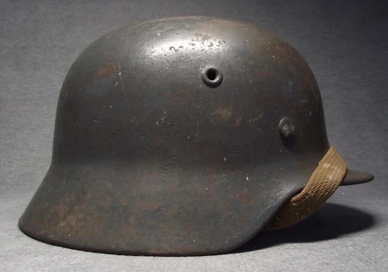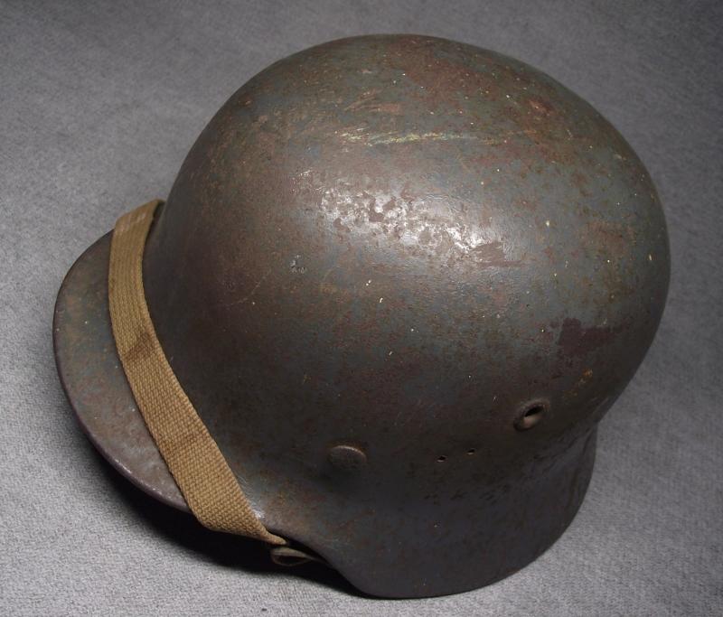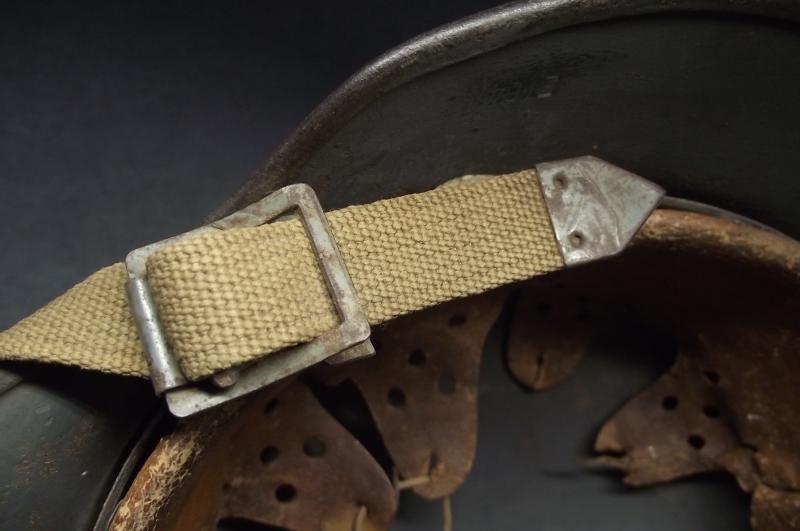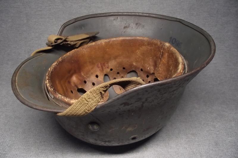 Nice wartime ET manufactured helmet with its period wartime liner system and chinstrap utilised from a wartime web equipment strap. The shell has over 90% of its grey finish to the outside with lots of wear from use, inside finish is close to 100%. Two small holes have been drilled into the shell to take the flaming bomb badge used by Austrian border guards. The inside wartime liner is complete with one small tear, couple of tongue have pulled through, one has come adrift to the tip, its named and has a large size stamp 56.The liner string again a nice wartime example. Another nice addition is the use of a wartime equipment strap as a chinstrap, both ends being riveted to the chinstrap bales. Side of the helmet is stamped ET64, rear lot number is 1074. Inside skirt has an ink stamp number 1098. The Austrians used lots of wartime shells in the late 1940's postwar and they come with various liner systems from civilian to wartime examples.