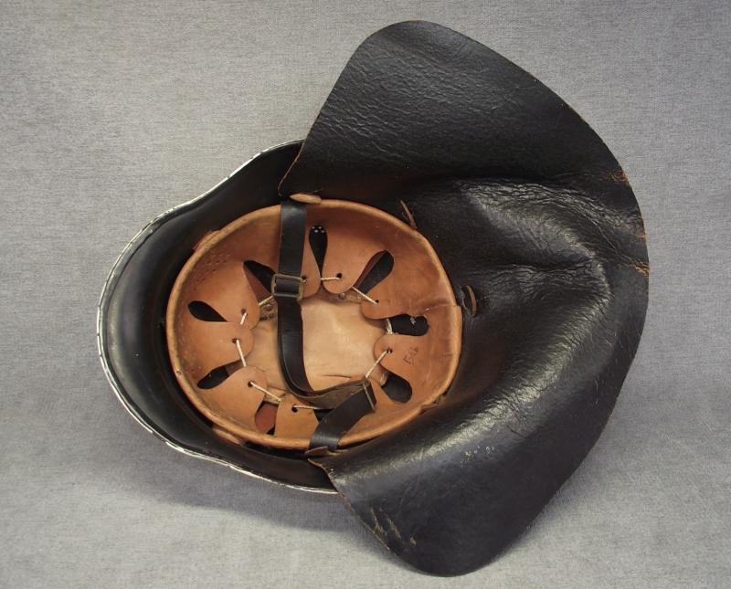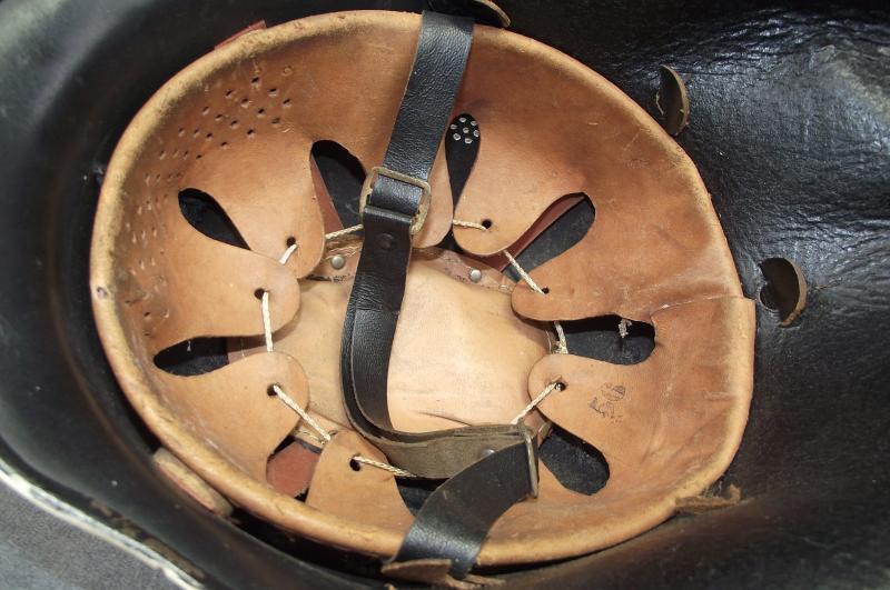 In very nice condition with nearly all its white paint remaining. The inside has a complete and in very nice condition liner system and chinstrap. This example comes with its period leather neck apron. The question asked is when the white paint was added, in my opinion its a postwar addition but still a nice clean example of a reissued wartime M34 helmet.