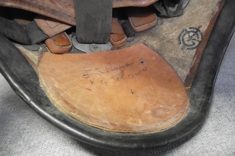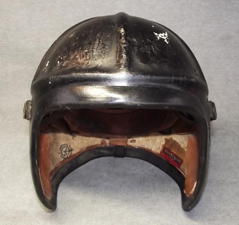 In good condition, repainted black over its first white finish with the number 82 painted to one side. The inside liner system would appear complete with both leather side plates named to three different pilots. Clear Gentexite label to the inside.