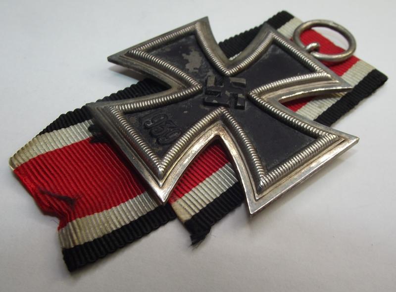 Nice cross with most of its finish intact, front has lost some of its period black, mainly to the left arm. The two piece frame is tight with minimal dark patina. The ring has a clear number 6 stamp. Comes with its period ribbon.