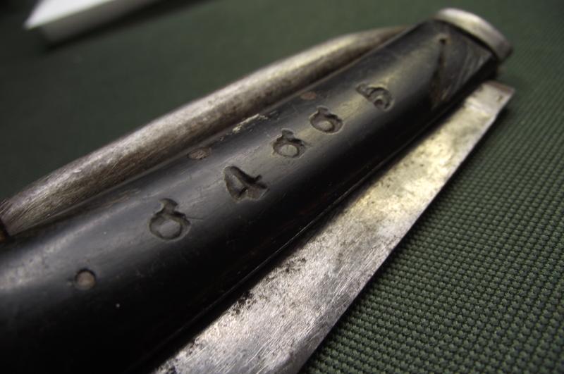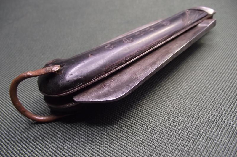 In very nice condition with minimal staining and minimal sharpening to the WD marked blade, same with the marlin spike. The horn scales have one area of damage near the front end near the steel bolster . One side has a soldiers number stamp. The blade is maker marked but slightly faded, could well be the firm Atkinson Brothers. Copper staple is in solid condition.